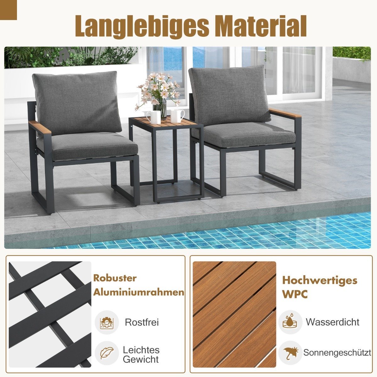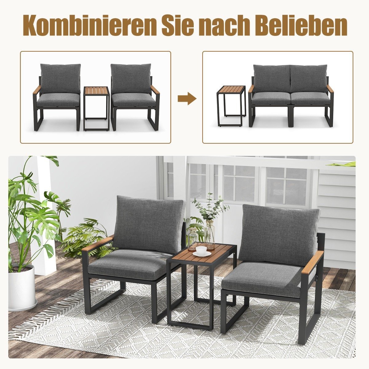 Atnaujinkite savo lauko erdvę su šiuo aukštos kokybės 3 dalių lauko baldų komplektu, pagamintu iš patvaraus aliuminio. Šis komplektas sukurtas ilgalaikiam naudojimui lauke, suteikdamas Jums komfortą ir stilių.