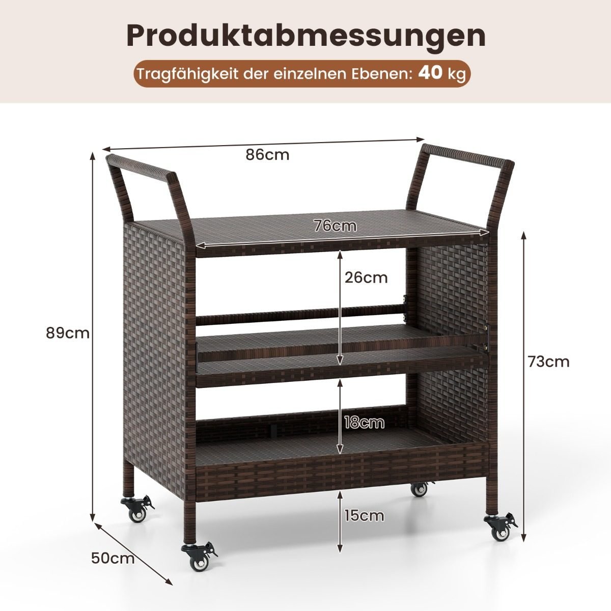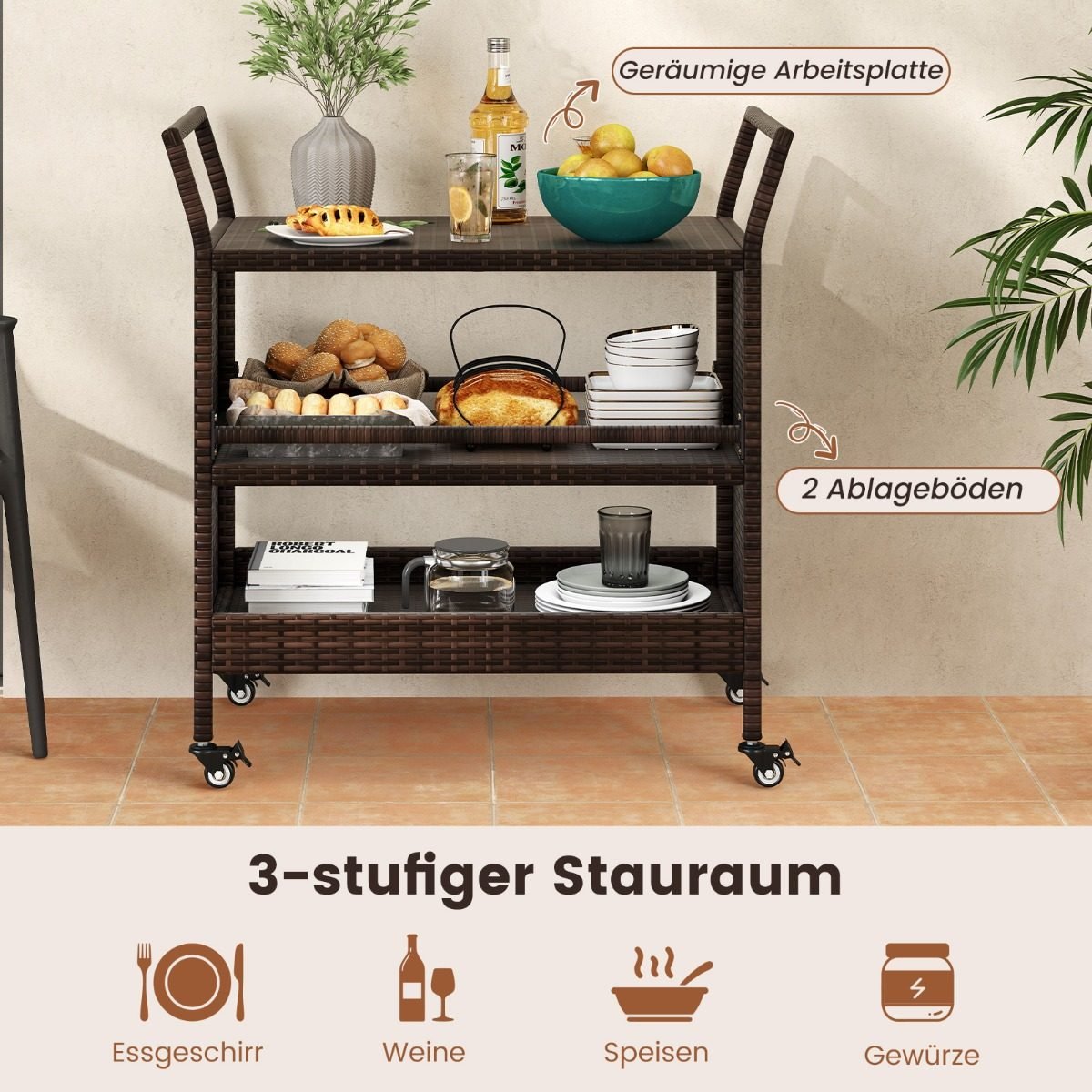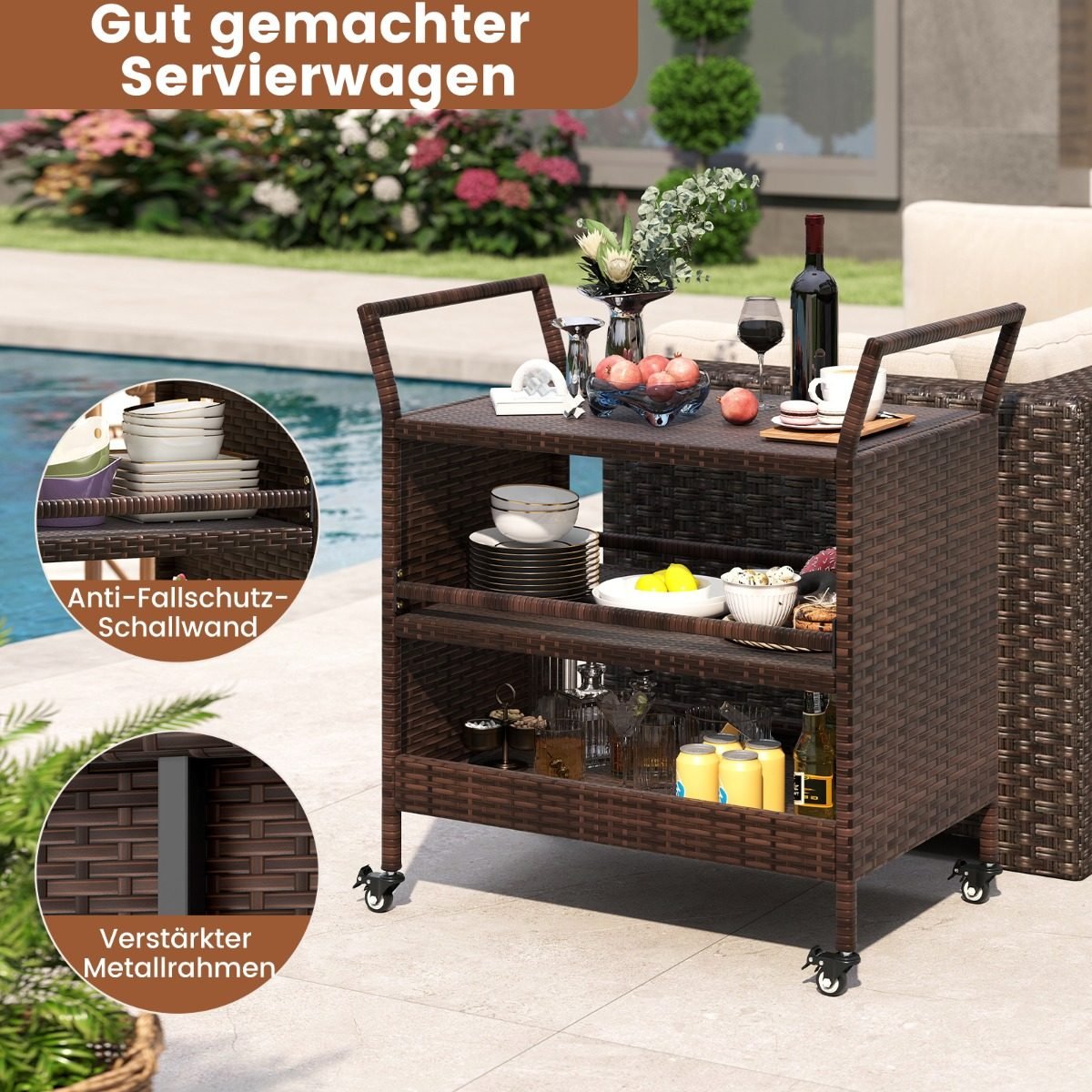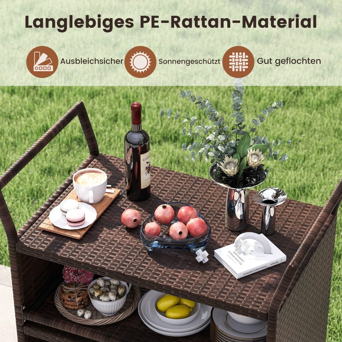 Atnaujinkite savo lauko erdvę su šiuo stilingu ir funkcionaliu baru ant ratukų. Pagamintas iš ilgaamžiško, saulės ir drėgmės atsparaus rotango, jis puikiai tiks vakarėliams sode, prie baseino ar ramiam poilsiui terasoje.