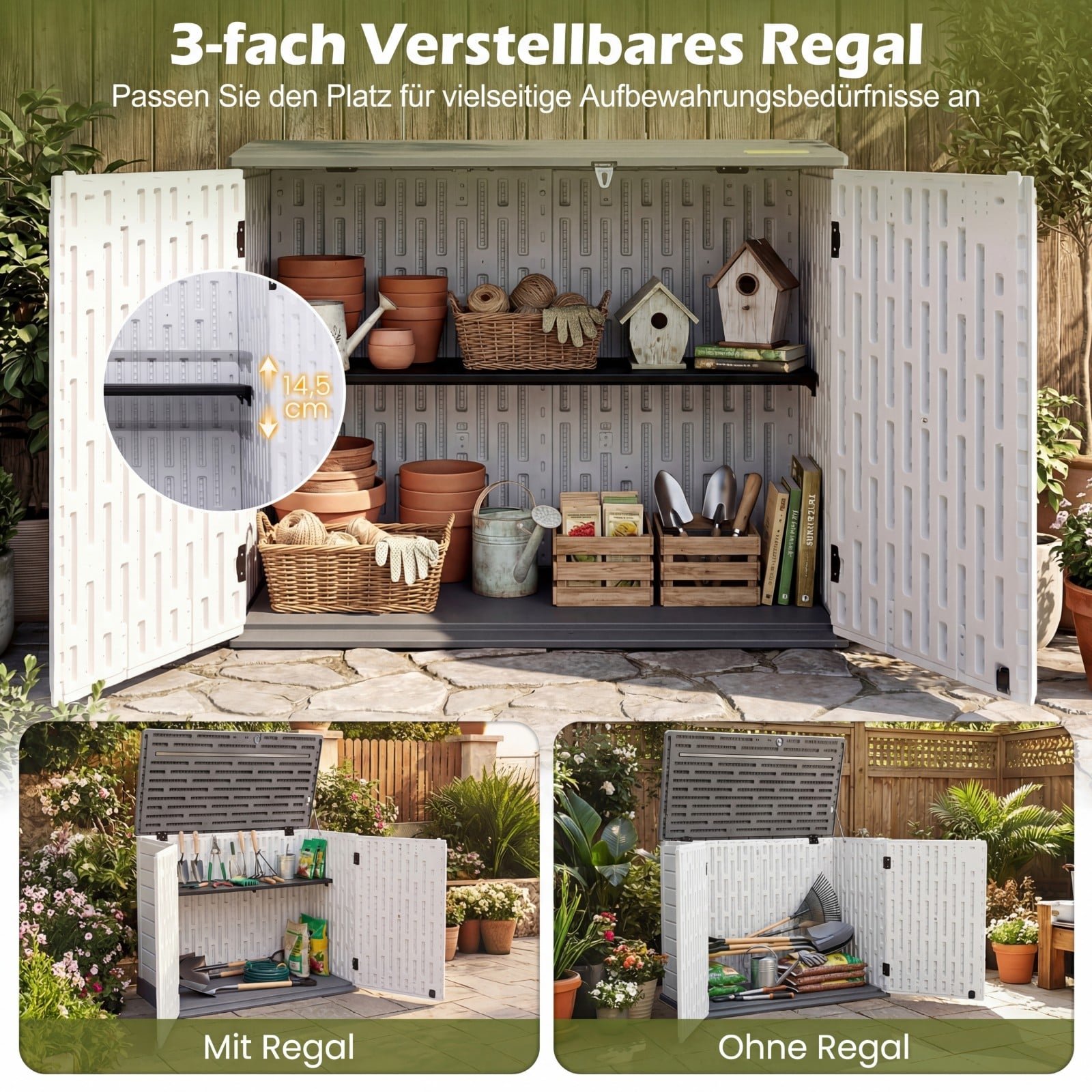 Optimalizuokite savo lauko erdvę su mūsų funkcionalia lauko daiktadėže! Pagaminta iš patvaraus ir oro sąlygoms atsparaus HDPE, ši horizontali daiktadėžė užtikrins ilgaamžiškumą ir patikimą naudojimą lauke. Su trimis reguliuojamo aukščio lentynomis ir užrakinamu dangčiu, ji puikiai tinka tvarkingai ir saugiai laikyti sodo įrankius, baseino reikmenis ar kitus smulkius daiktus.