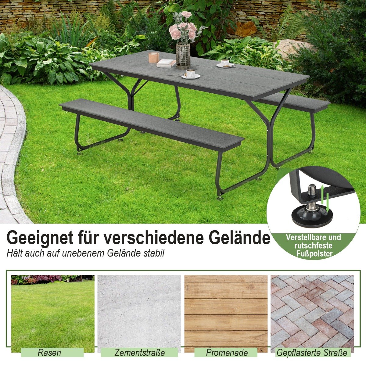 Lauko pikniko stalas su suolais (Pilka)