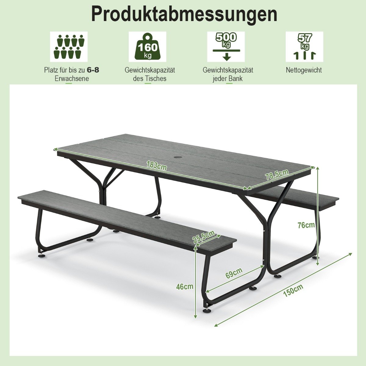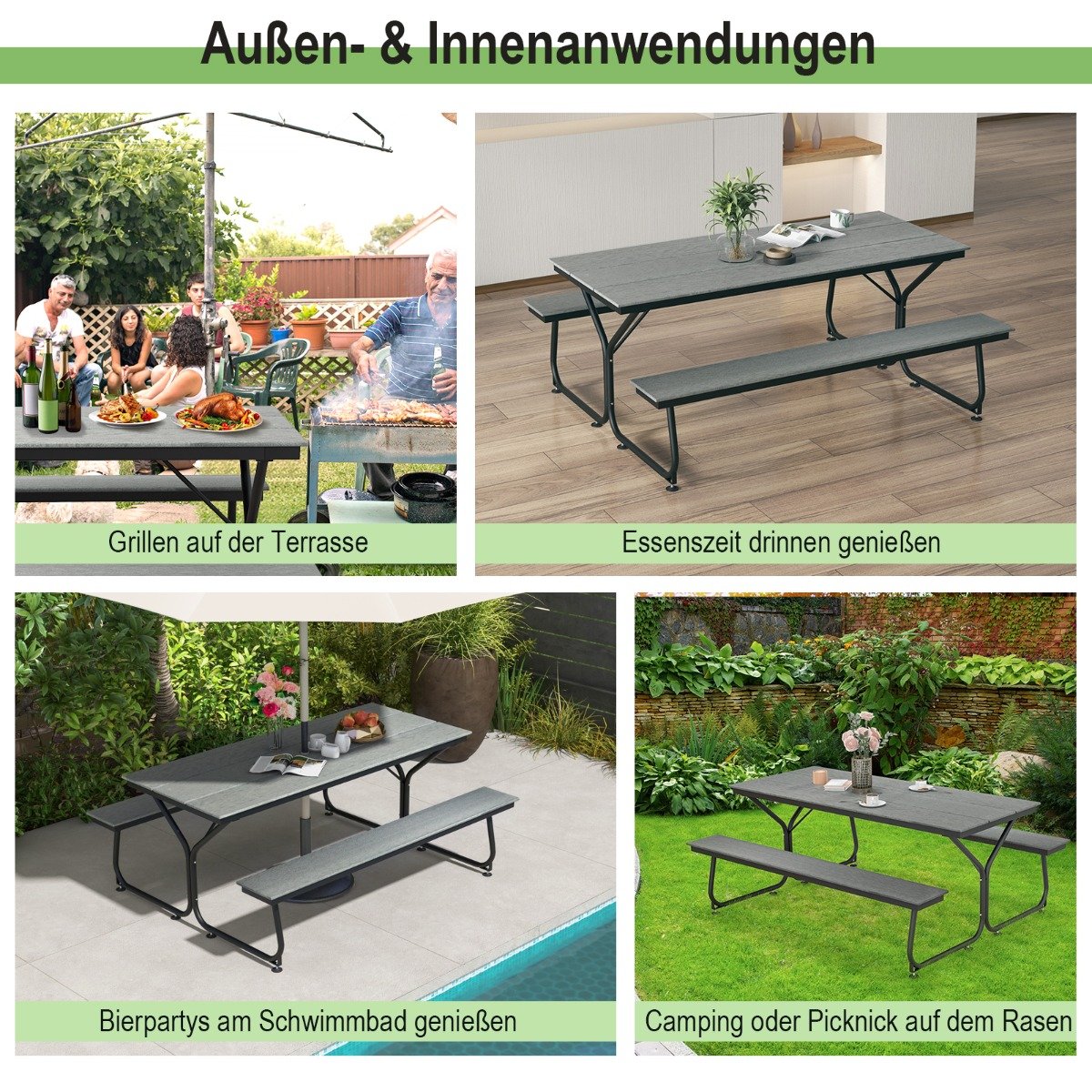 - Tvirtas ir ilgaamžis HDPE stalviršis su natūralaus medžio imitacijos tekstūra.