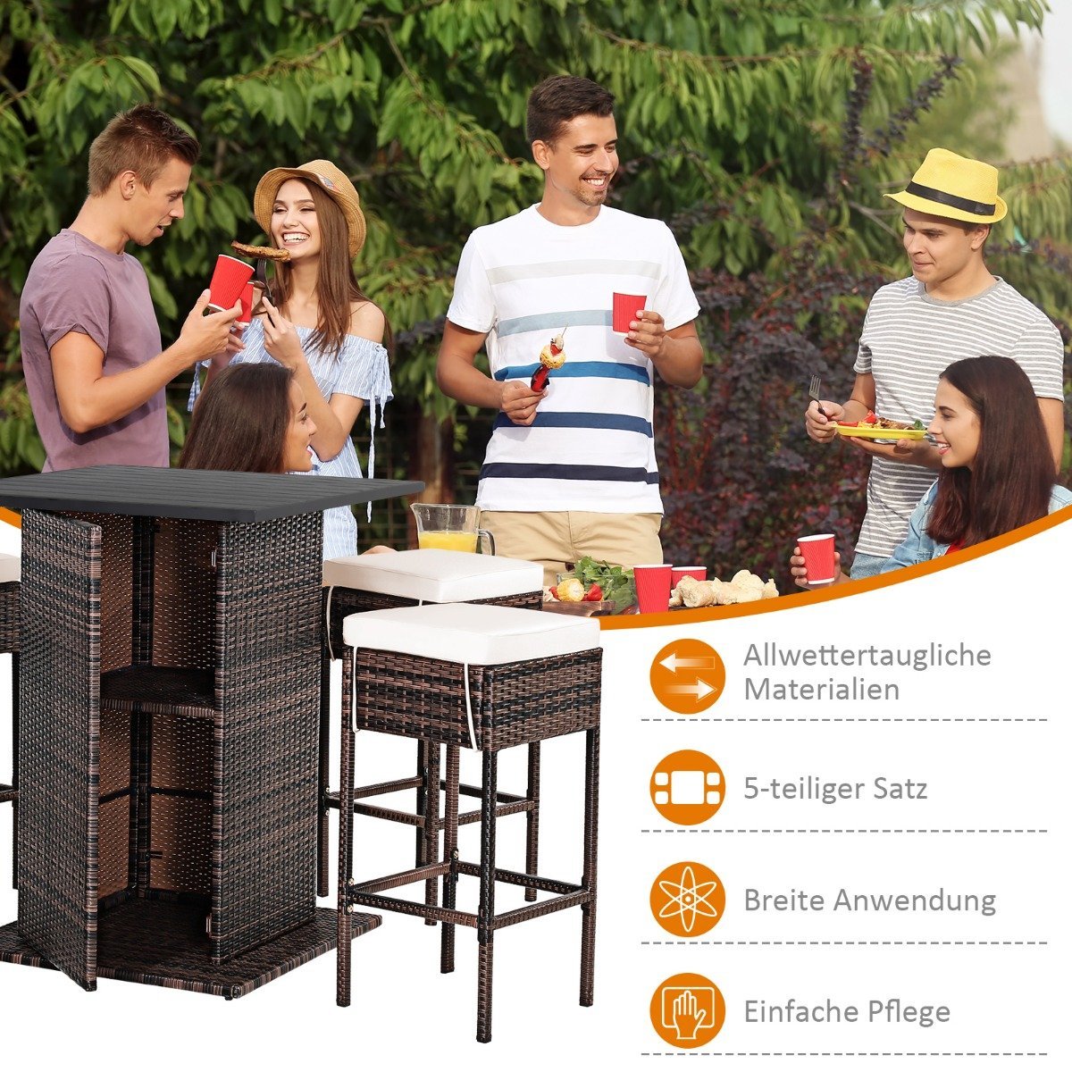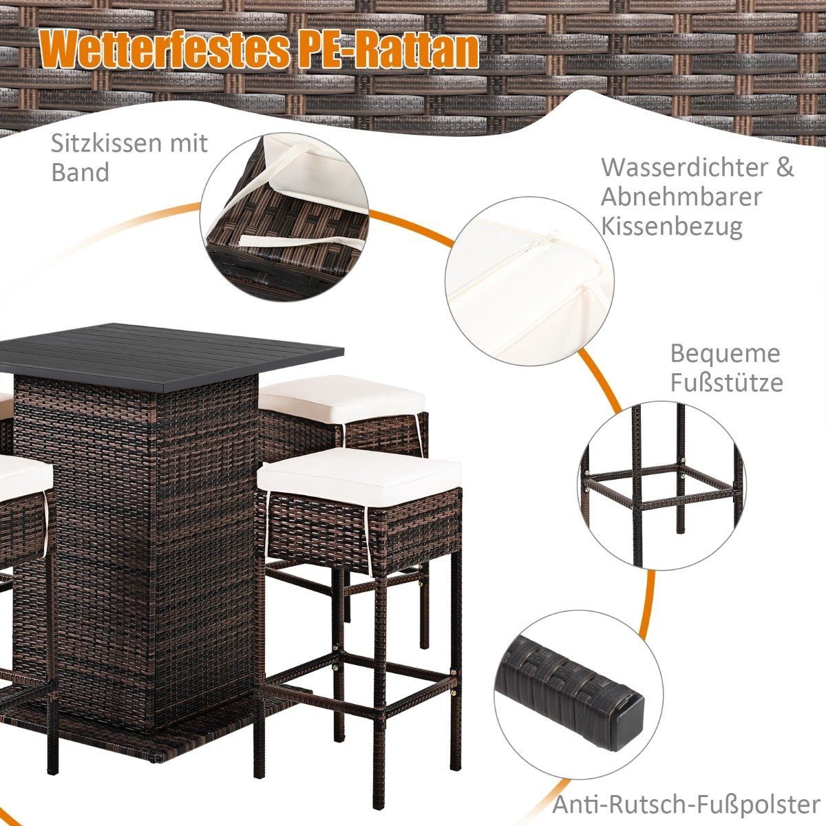 Atnauinkite savo lauko poilsio erdvę su šiuo stilingu ir funkcionaliu 5 dalių rataniniu baru. Idealiai tinkamas sodui, terasai ar prie baseino, šis komplektas suteikia patogumo ir elegancijos.