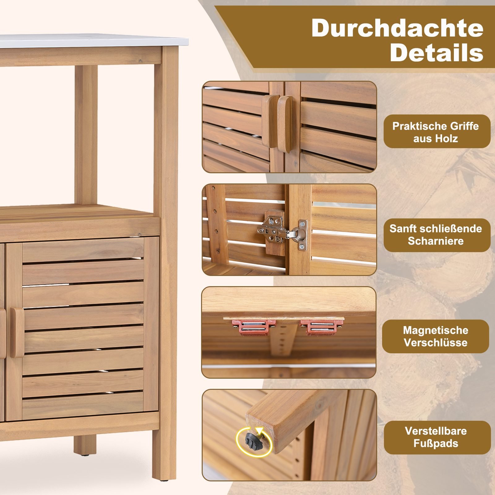 Pagerinkite savo sodo patirtį su šiuo universaliu darbo stalu! Pagamintas iš aukštos kokybės akacijos medienos, jis ne tik užtikrina tvirtą ir ilgaamžę konstrukciją, bet ir suteikia jūsų lauko erdvei natūralaus žavesio. Dėl erdvaus stalviršio ir patogios laikymo vietos tvarkingai sutvarkysite visus sodo reikmenis.