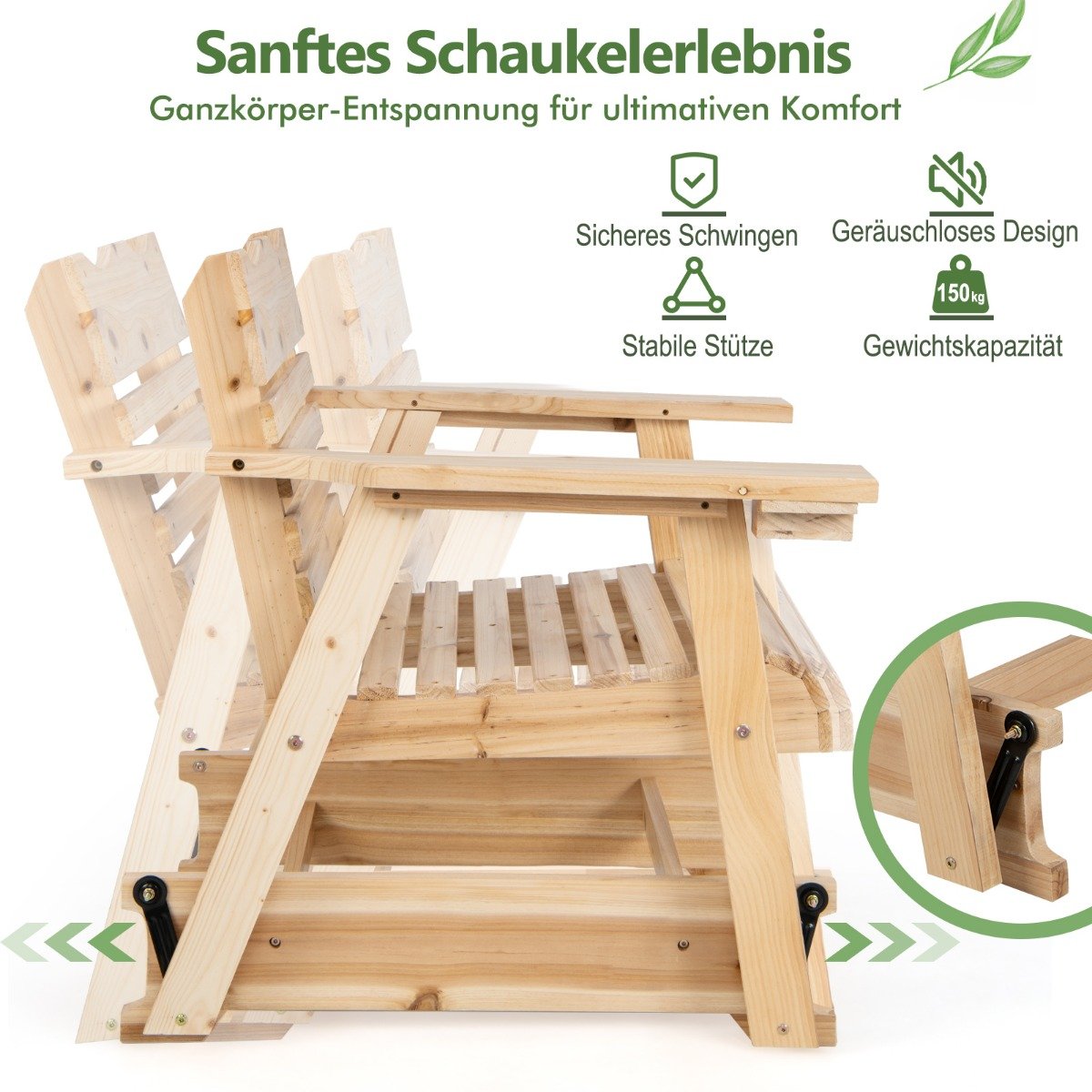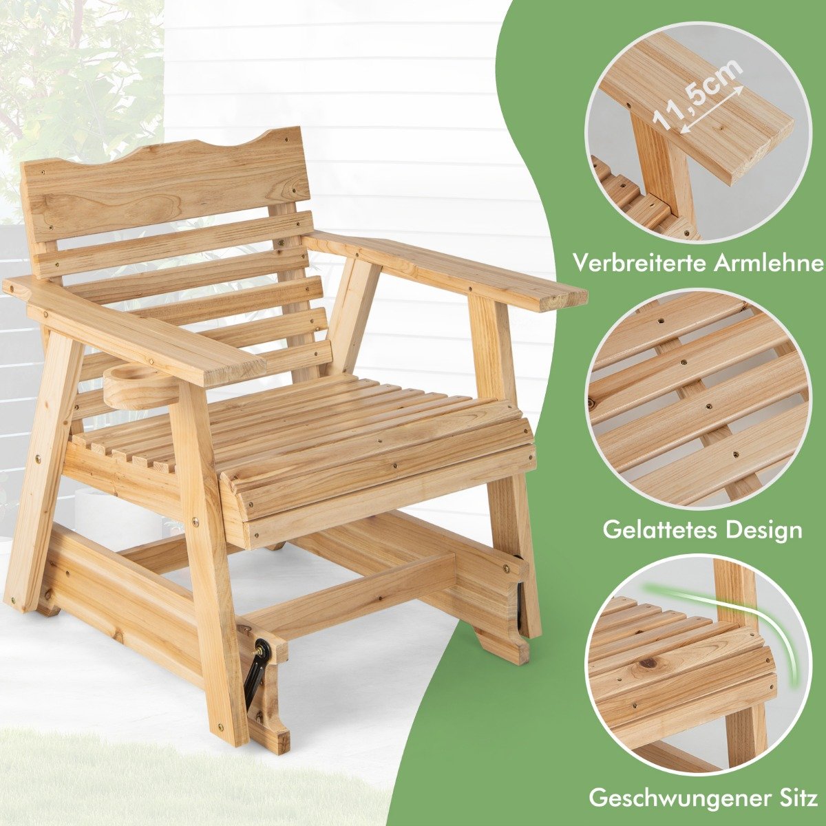 Atsipalaiduokite ir pamirškite kasdienius rūpesčius su šiuo mediniu lauko supamuoju krėslu. Sukurtas su lanksčiais metaliniais jungimais ir tvirtu pagrindu, jis leidžia mėgautis ramiomis akimirkomis ir efektyviai mažina nuovargį.