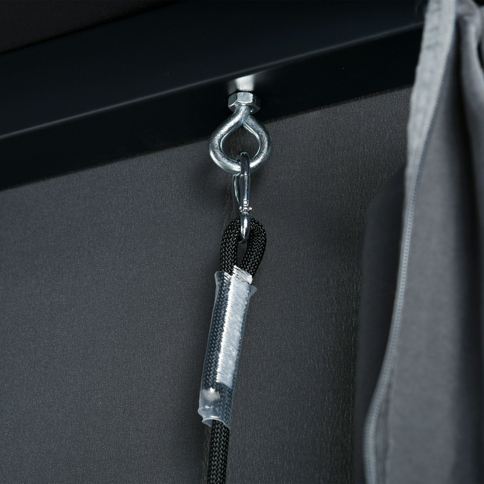 Atsipalaiduokite stilingai su šiuo lauko komplektu. Šioje lauko supamoje lovoje galėsite mėgautis vasara, saugiai pasislėpę po baldakimu. Baldakimas ir šoninės sienelės apsaugo jus nuo vėjo, lietaus ir nepageidaujamų žvilgsnių. Prireikus užuolaidas galite atitraukti ir pritvirtinti prie rėmo. Jūsų šeima pamėgs šią apsaugotą poilsio zoną. Mėgaukitės laisvalaikiu po atviru dangumi su šiuo lauko komplektu.