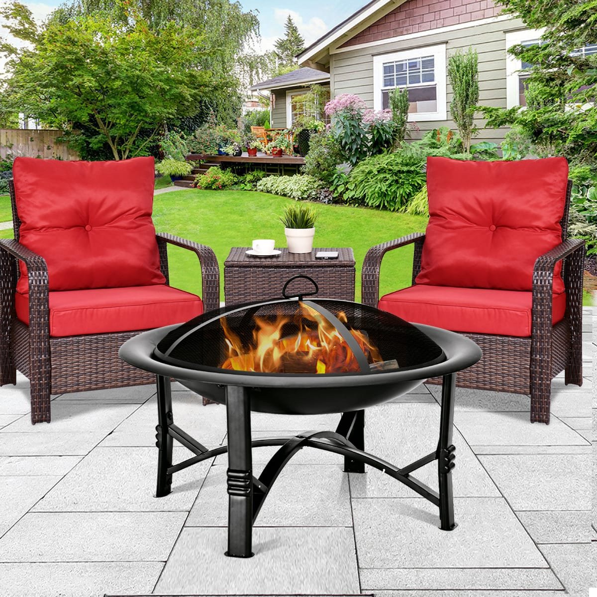 - Grilio malonumai: Pridedamos grotelės leidžia ugniavietę paversti funkcionalia kepsnine, o anglies grotelės užtikrina galimybę kontroliuoti liepsną, kad galėtumėte mėgautis tobulais grilio patiekalais.