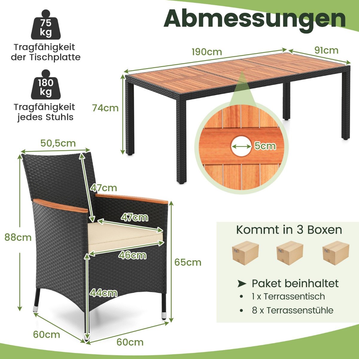 • Medžiaga: Akacijos mediena, PE rotangas, metalas, 180 g neaustinis audinys, putplastis