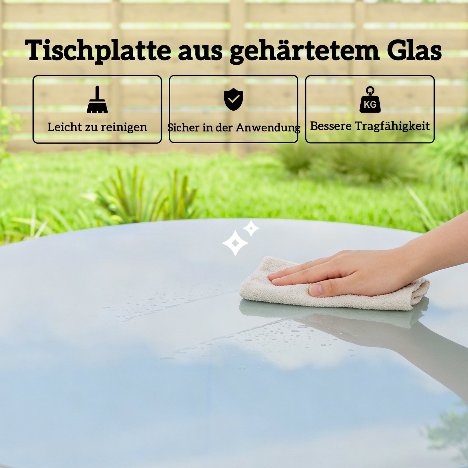 ✔ Sujungia pilką, šilko rašto stiklo stalviršį su PE ratanu, sukurdamas elegantišką išvaizdą