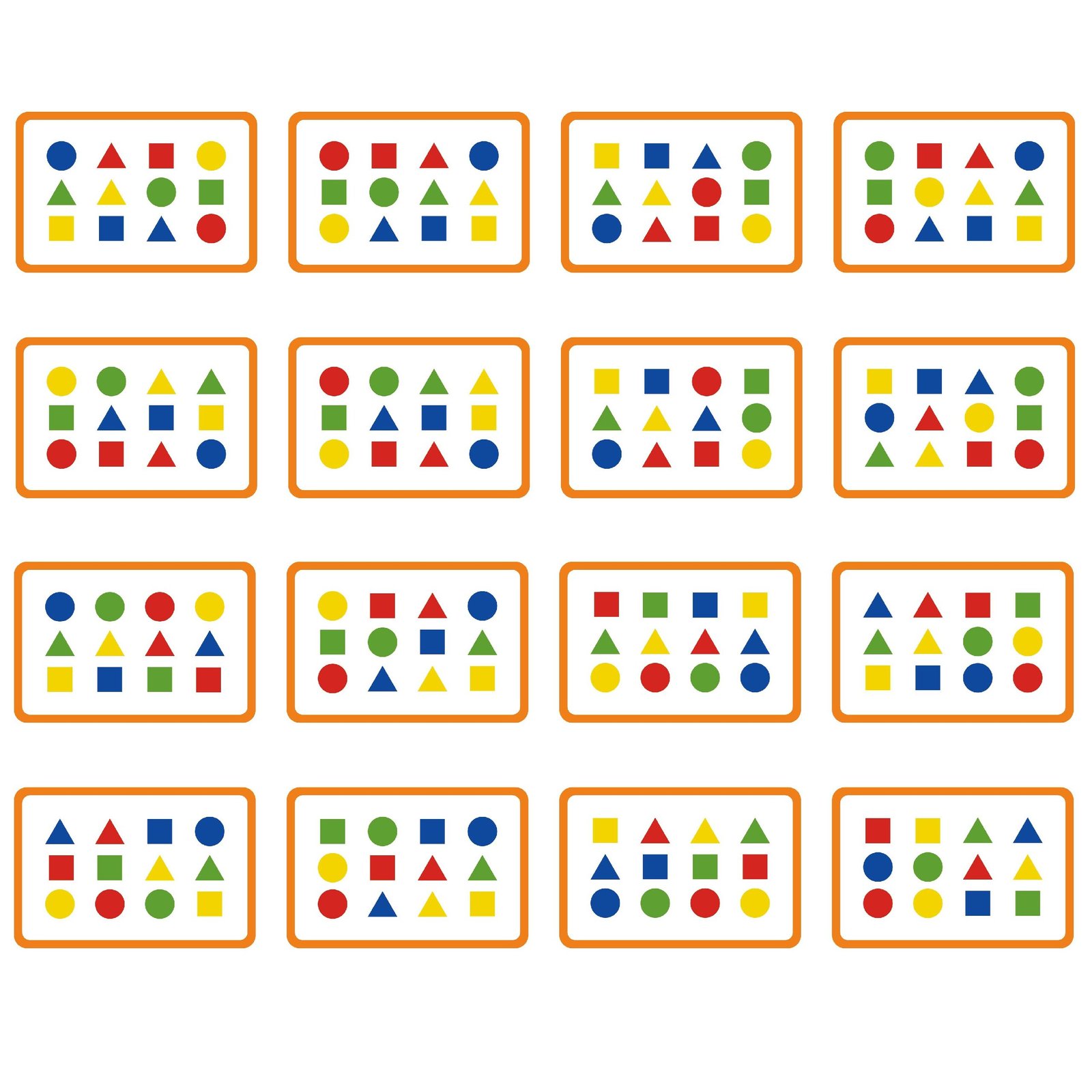 - 12 dvipusių blokelių: vienoje pusėje spalvos, kitoje – spalvotos geometrinės figūros.