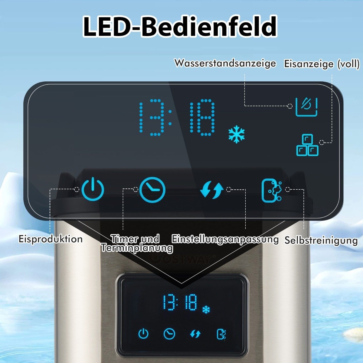 - Aukštos kokybės kompresorius leidžia pagaminti iki 24 kg ledo per parą, o pirmieji ledo gabalėliai paruošiami vos per 20 minučių.
