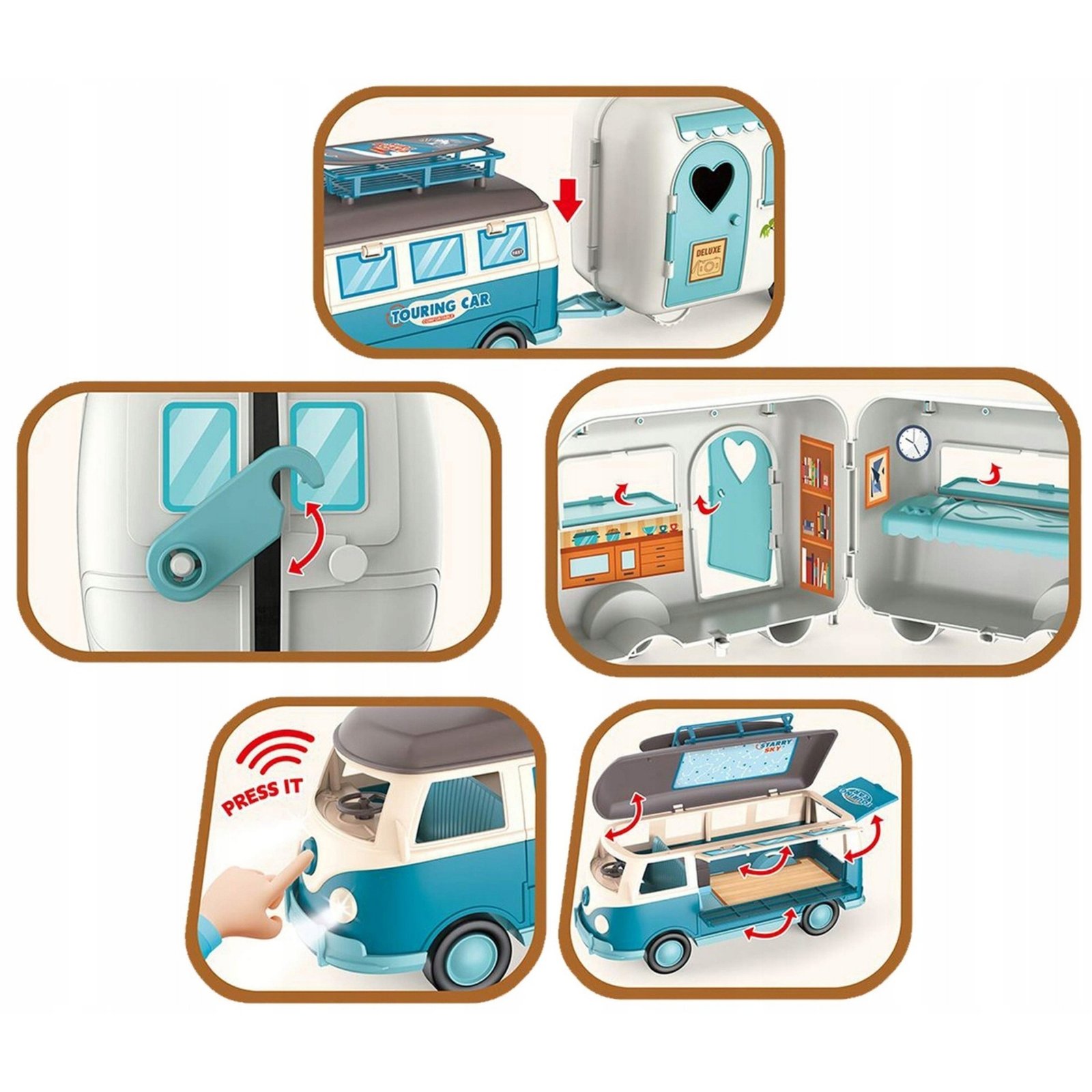 Leiskitės į nuotykių kupiną kelionę su šiuo kemperiu ir priekaba! Šis spalvingas, retro stiliaus žaislas puikiai tinka mažiesiems tyrinėtojams, mėgstantiems kūrybiškai žaisti. Kemperis su priekaba pasižymi atidaromomis dalimis, tikrovišku interjeru bei šviesos ir garso efektais, kurie pavers kiekvieną kelionę nepamirštama. Tai puikus pasirinkimas dovanai, skatinantis vaizduotę ir kūrybiškumą.