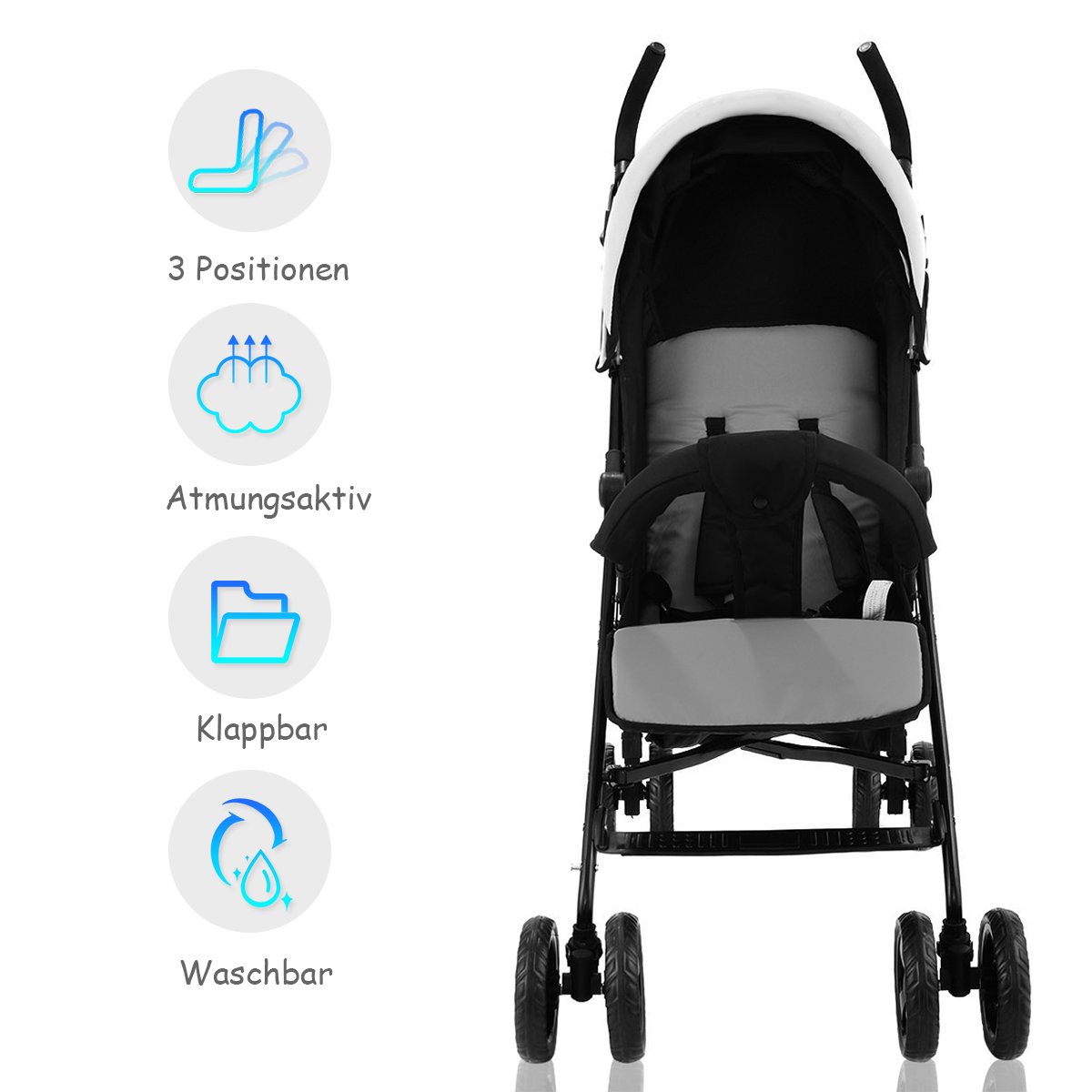 • Reguliuojamas komfortas: Didelis stogelis, atlošas ir kojų atrama reguliuojami, užtikrinant puikią apsaugą nuo saulės, vėjo ir lietaus.