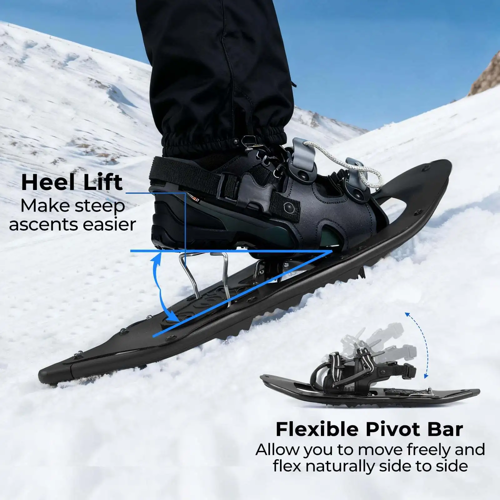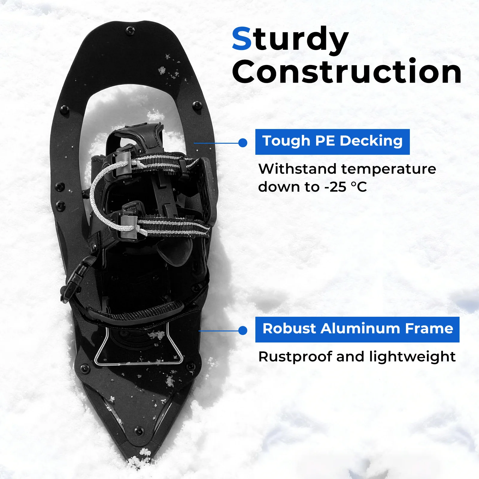- Greita ir patogi tvirtinimo sistema leidžia lengvai užsidėti ir pritaikyti sniegbačius prie avalynės.