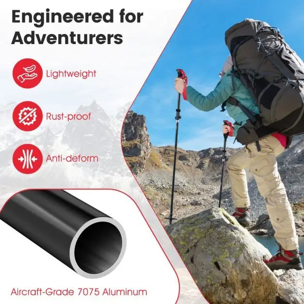 - Aukščiausios kokybės 7075 aliuminis: Pagamintos iš aukščiausios kokybės 7075 aviacinio aliuminio, šios žygio lazdos yra itin atsparios lenkimui ir lūžimui net sudėtingiausiomis kalnų sąlygomis. Jos taip pat atsparios korozijai.