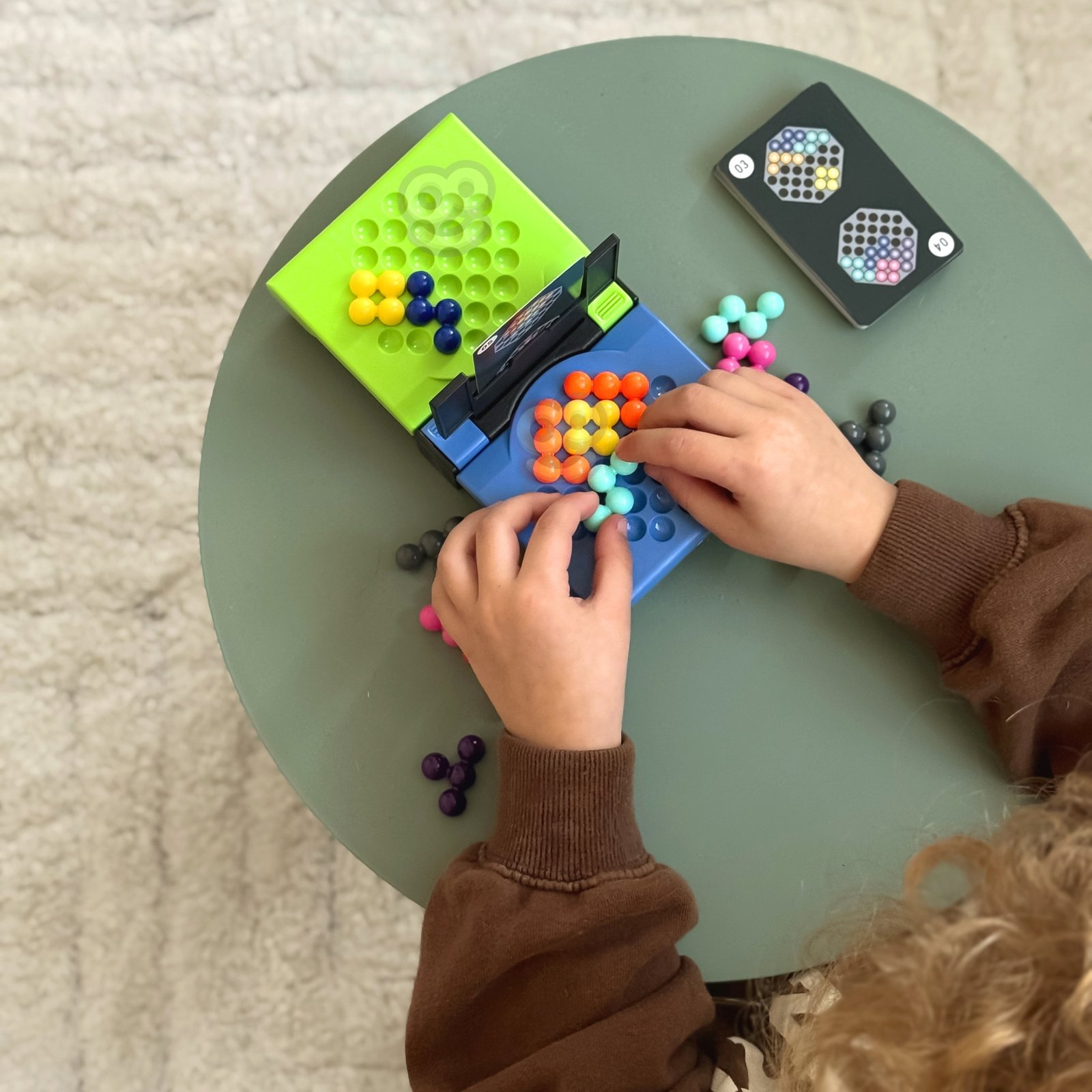 - Iš savo spalvotų rutuliukų žaidėjai kuo greičiau stengiasi sudėlioti raštą, pavaizduotą ant priešais juos esančios kortelės.