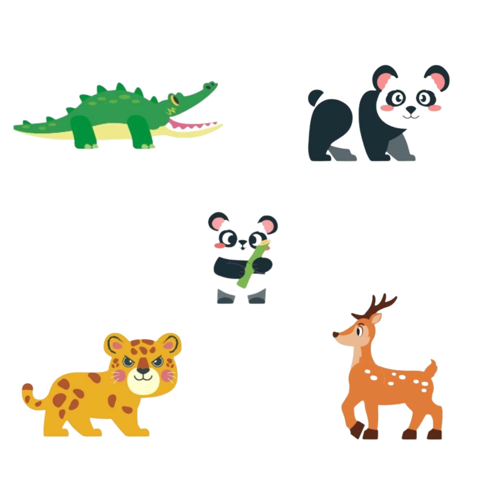 - Gyvūnų figūrėlės: 2 x panda, leopardas, elnias, krokodilas.