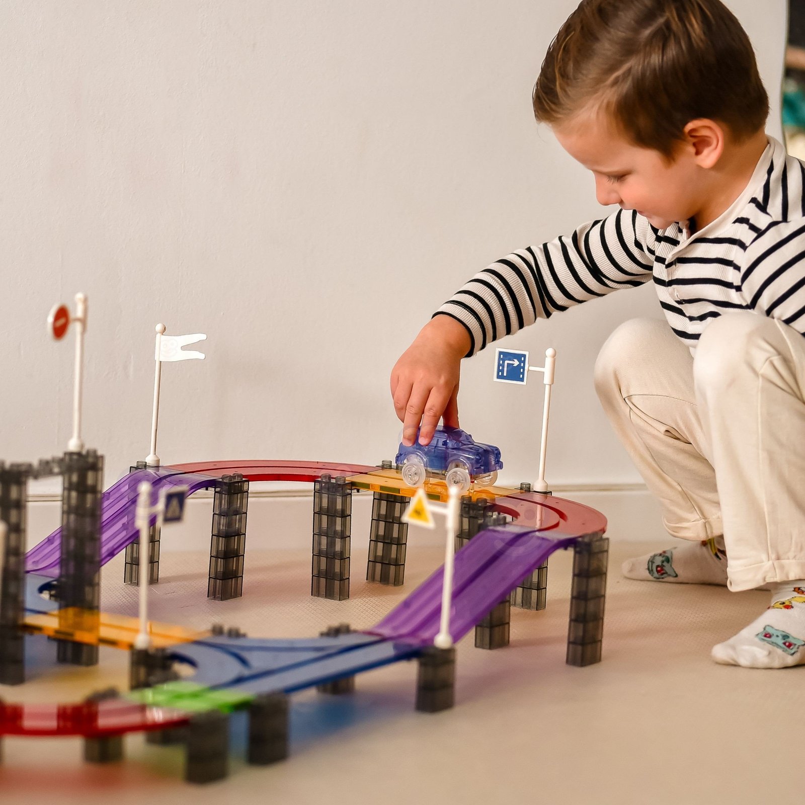 „Woopie“ magnetinis lenktynių trasos rinkinys – tai žaislas, skatinantis vaiko kūrybiškumą ir leidžiantis kurti įtraukiančius žaidimus. Lengvai sujungiami magnetiniai elementai suteikia galimybę mažyliams patiems konstruoti įvairias, kelių lygių trasas, kuriomis važinės šviečiantis visureigis automobilis. Skaidrios, spalvingos detalės ir ryškios LED lemputės užtikrina, kad žaidimas patrauks dėmesį ir džiugins tiek dieną, tiek vakare.