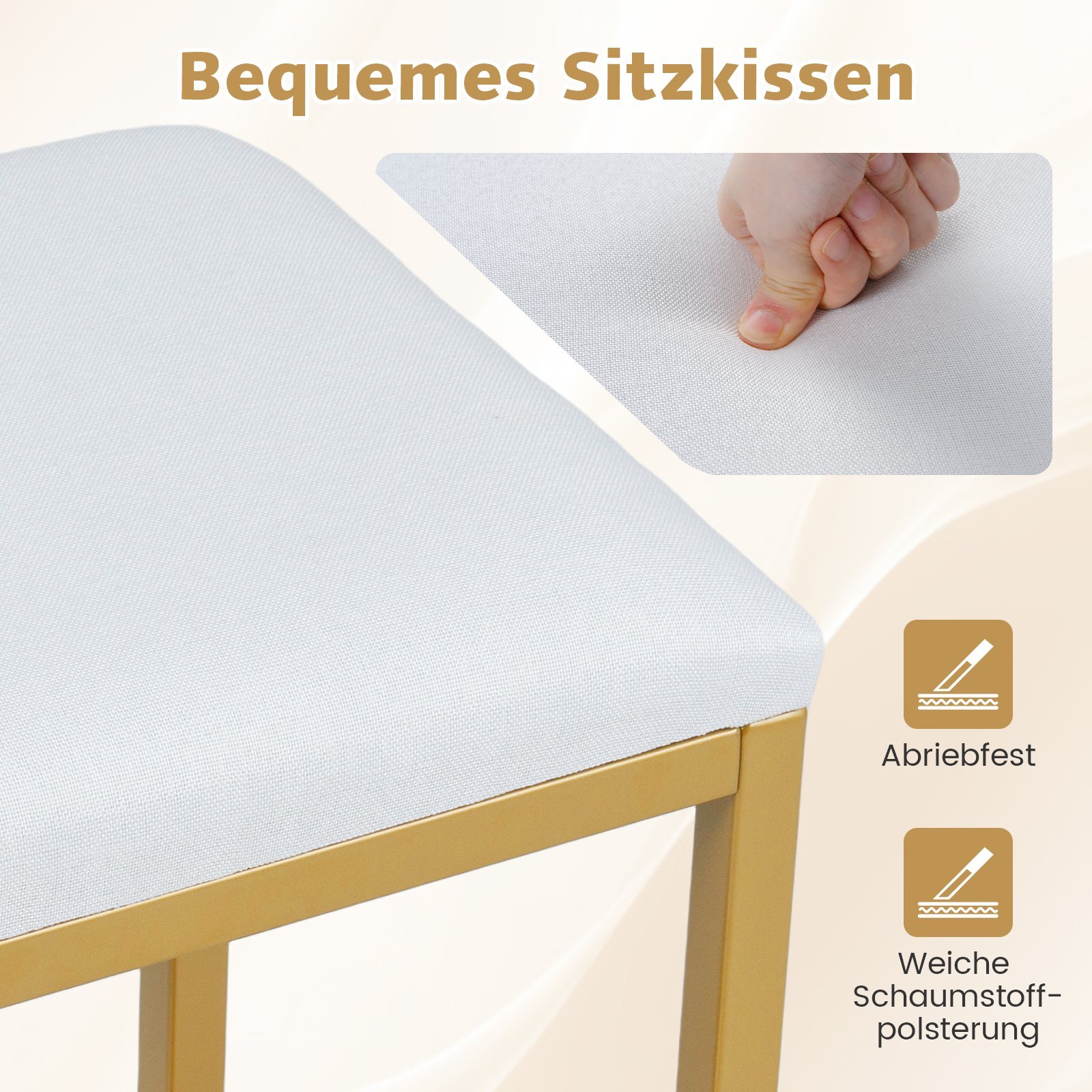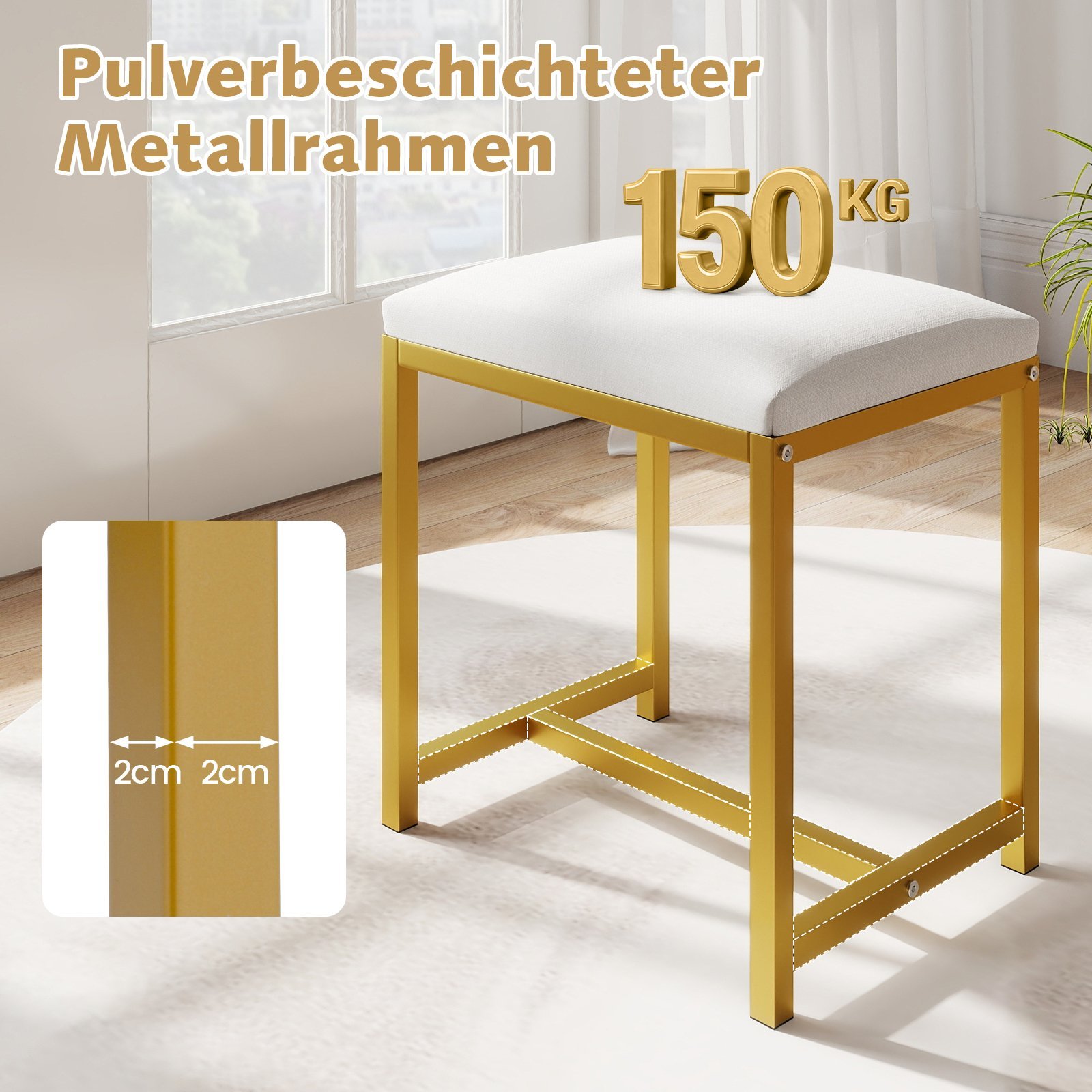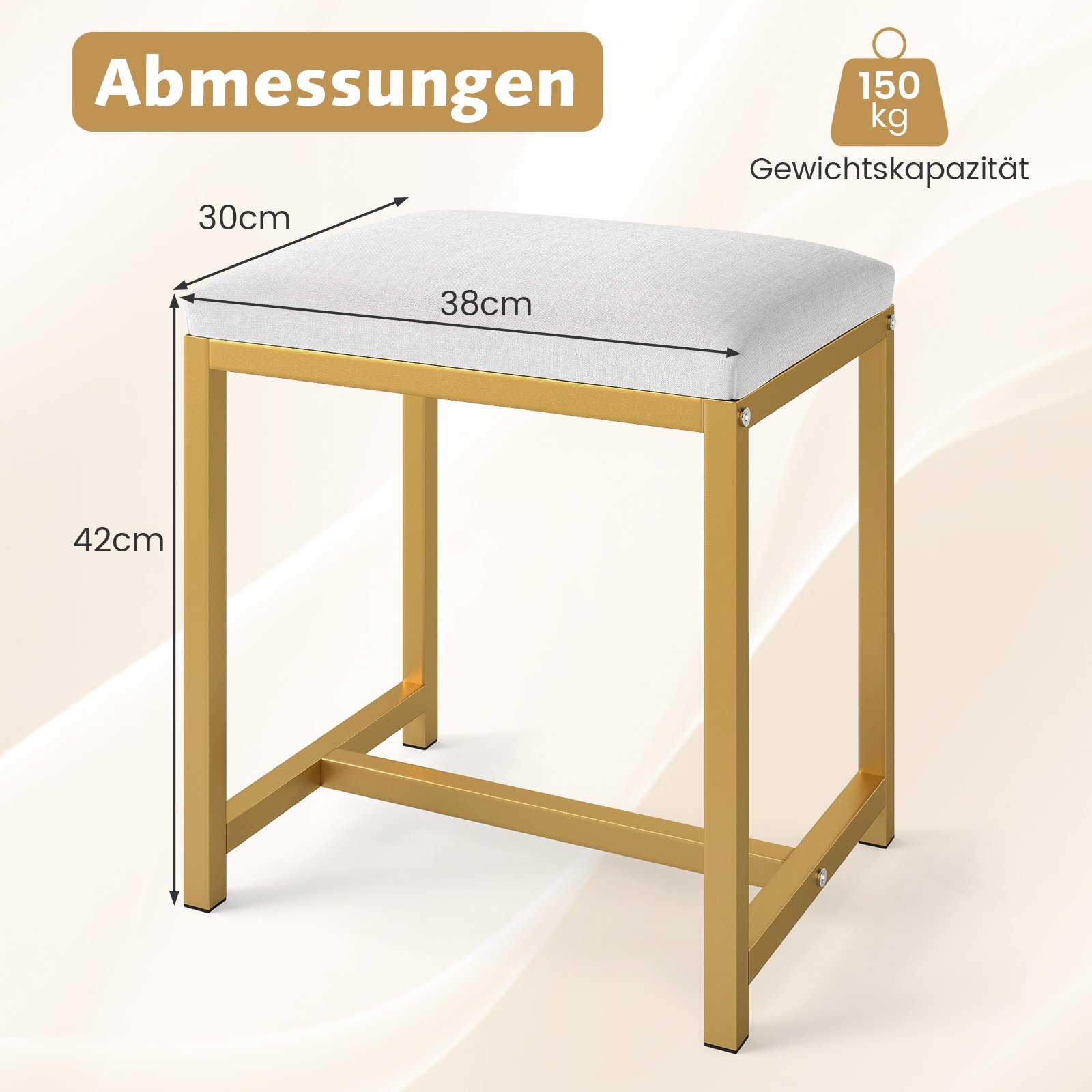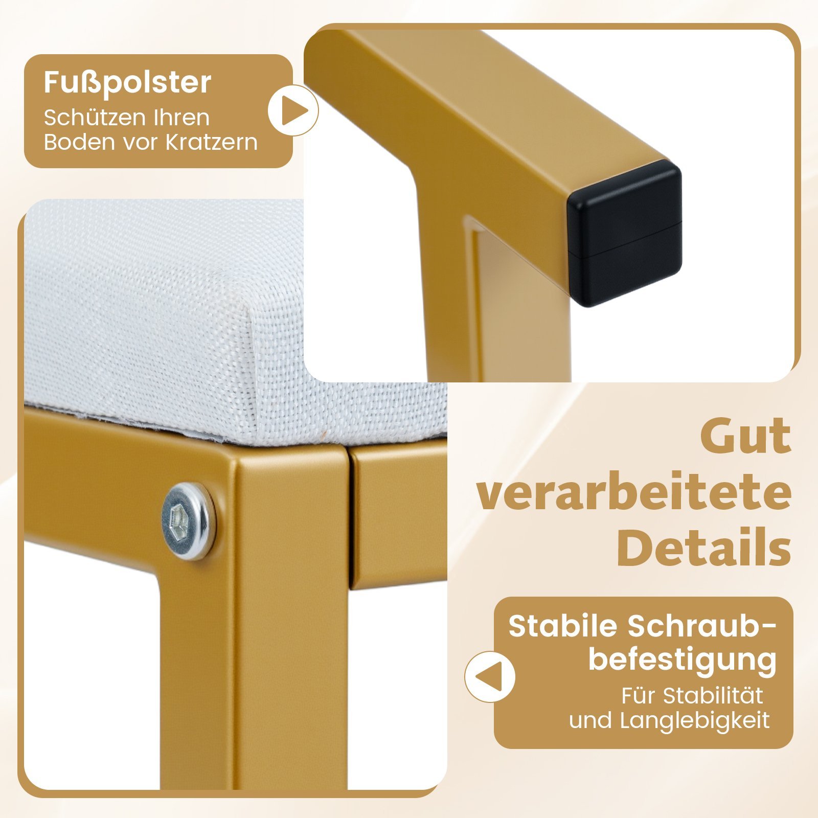 Patirkite stilių ir ilgaamžiškumą su šia elegantiška makiažo kėdute! Jos modernus, auksinės spalvos metalinis rėmas užtikrina išskirtinį stabilumą ir atlaiko iki 150 kg. Minkšta, putplasčiu užpildyta ir vandeniui atspariu audiniu aptraukta sėdynė užtikrina komfortą, o universalus dizainas leidžia kėdutę naudoti kaip makiažo kėdę, pufą ar papildomą sėdimą vietą bet kurioje patalpoje.