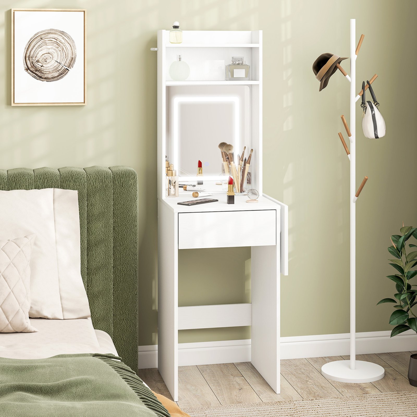 Pasiruoškite išėjimui stilingai ir patogiai su kompaktišku kosmetiniu staliuku su veidrodžiu – puikiai tinka mažiems kambariams ar butams. LED veidrodžio šviestuvas su trimis reguliuojamais spalvų režimais (natūralus, šiltas, šaltas) prisitaiko prie jūsų poreikių. Išskleidžiama šoninė kosmetinio staliuko dalis suteikia daugiau vietos, o lentynos ir stalčius padeda viską laikyti tvarkingai. Nuostabus patobulinimas jūsų kasdienėms rutinoms.