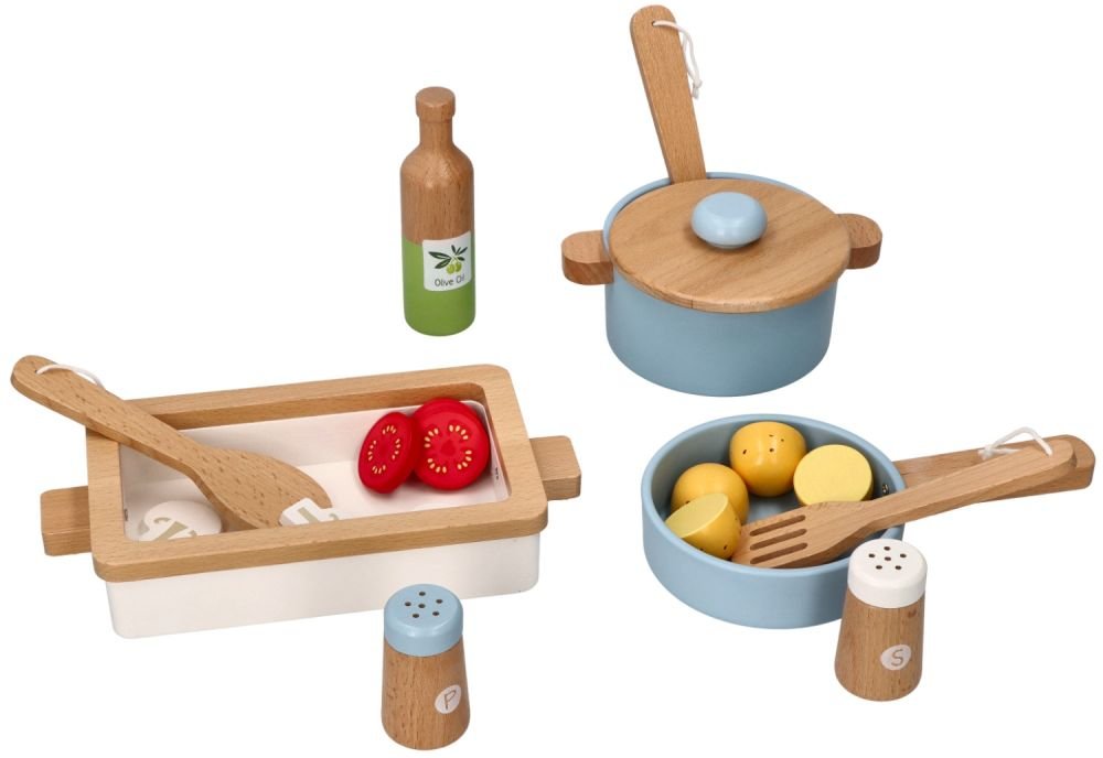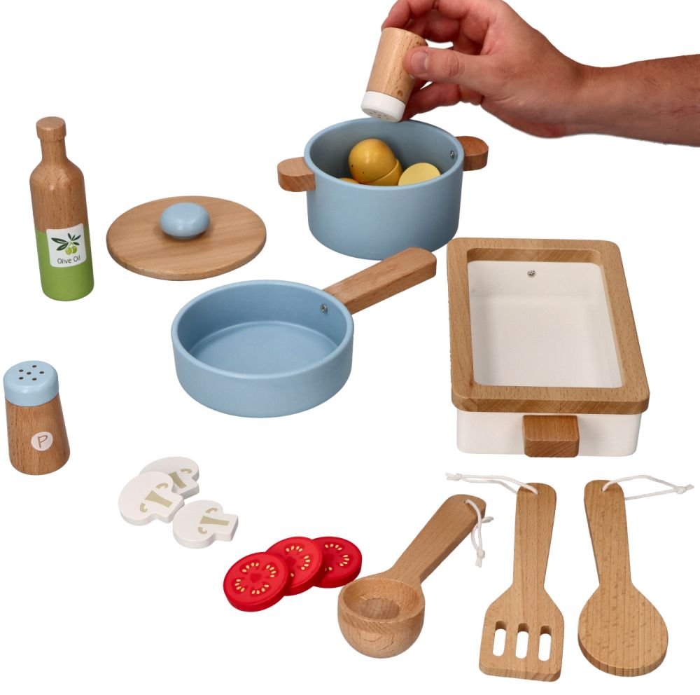Laikas leistis į kulinarinius nuotykius vaikų virtuvėje! Šis kruopščiai pagamintas medinis virtuvės komplektas yra puikus žaislas mažiesiems maisto gaminimo entuziastams. Rinkinyje yra viskas, ko reikia puotai sukurti: kepimo skarda, puodas su dangčiu, keptuvė, mediniai šaukštai ir prieskonių indeliai – druskai ir pipirams.
