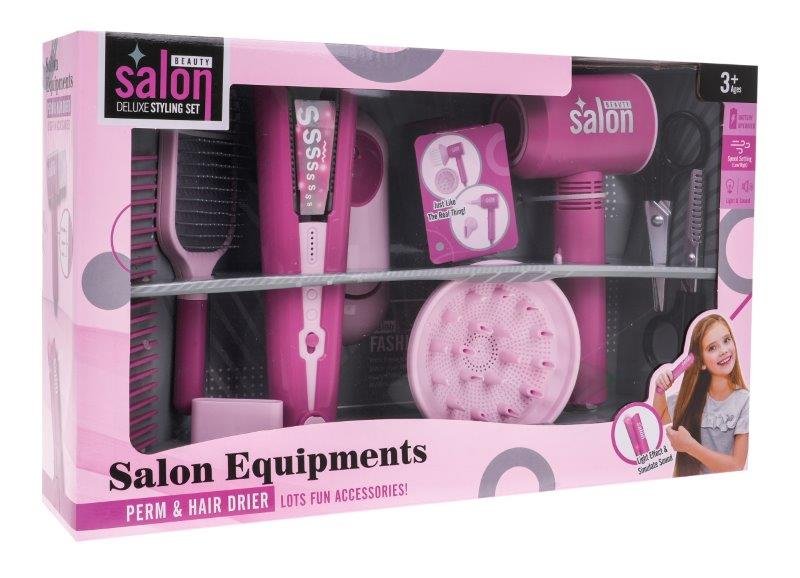 Interaktyvus, puikiai įrengtas kirpimo rinkinys su plaukų džiovintuvu su keičiamais antgaliais ir baterijomis maitinamu plaukų tiesintuvu skirtas vaikams nuo 3 metų. Į komplektą įeina platus kirpėjo darbui reikalingų įrankių asortimentas – plaukų džiovintuvas, tiesintuvas, žirklės, plaukų šukos ir kiti aksesuarai. Plaukų džiovintuvas skleidžia džiovinimo garsą ir skleidžia oro srovę. Jis turi dviejų pakopų oro srauto reguliavimą, o džiovinimo metu skleidžia garsus kaip tikras. Tiesinimo priemonė turi šviesos efektus ir garsus, lydinčius plaukų tiesinimą.