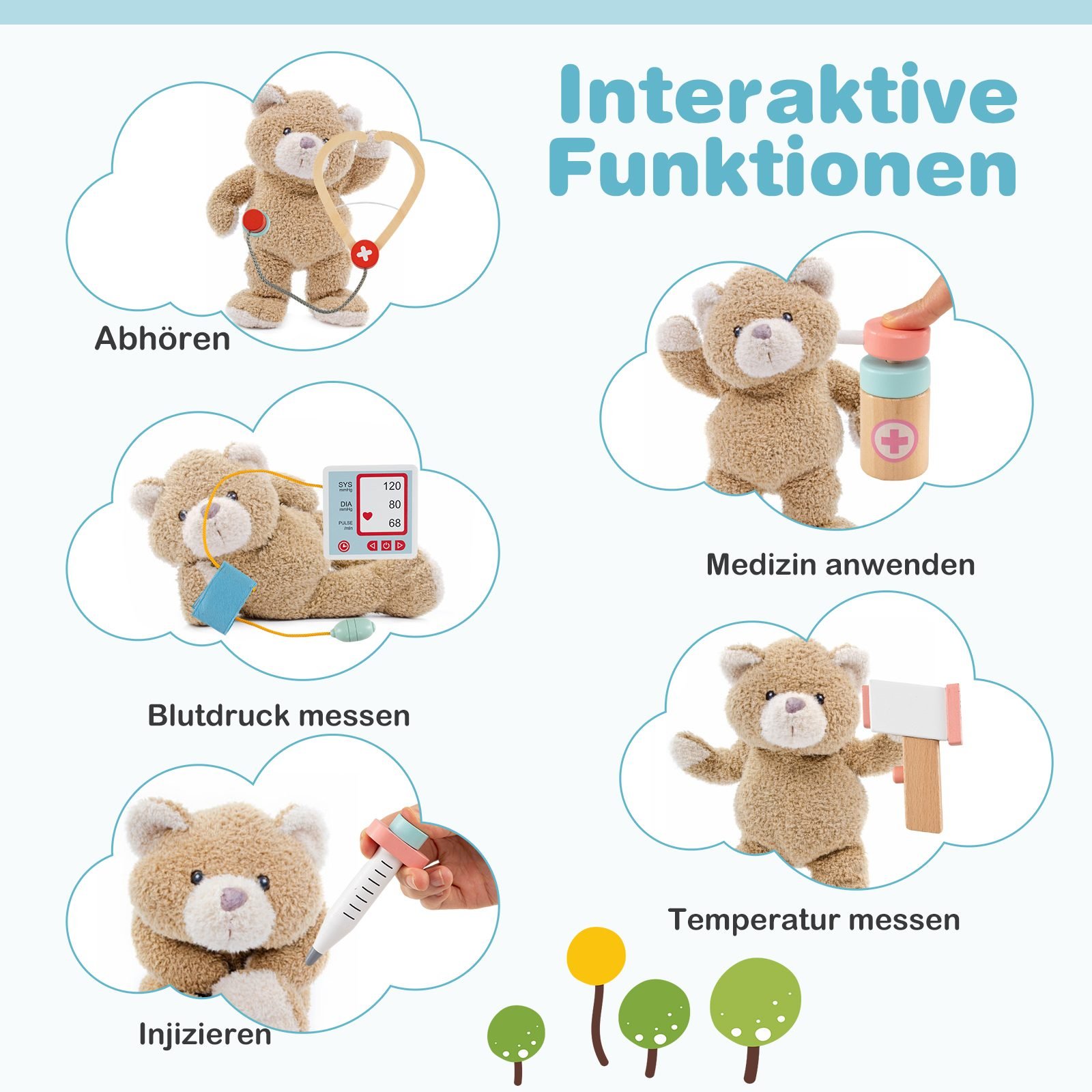 Skatinkite vaiko vaizduotę ir ugdykite rūpinimosi kitais įgūdžius su mūsų mediniu medicininių instrumentų žaidimų rinkiniu! Sukurtas atsižvelgiant į vaikų raidą ir saugumą, šis rinkinys siūlo daugybę interaktyvių elementų, kurie leis vaikams pasijusti tikrais gydytojais.