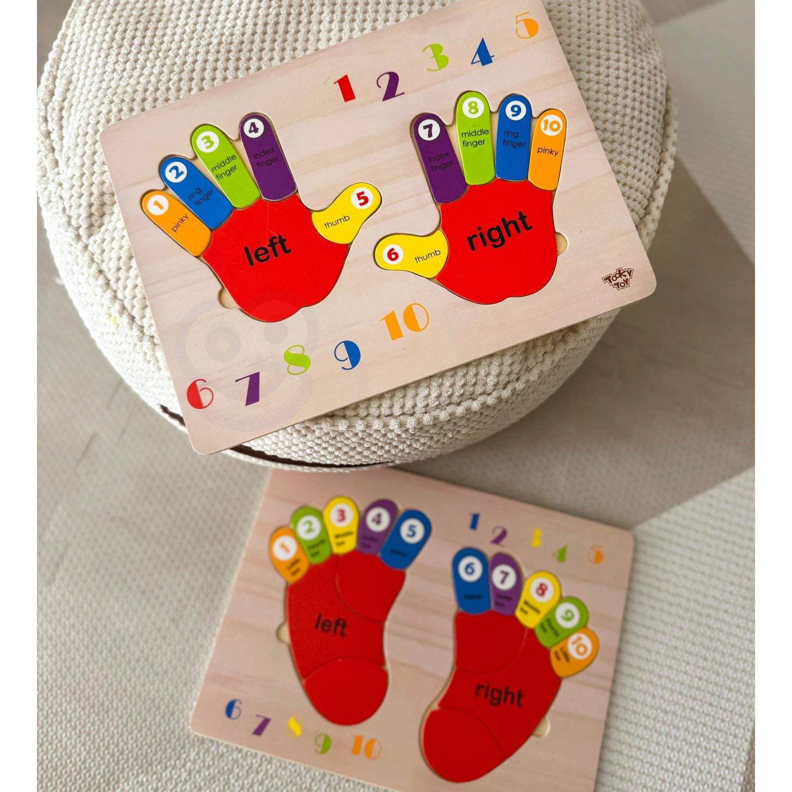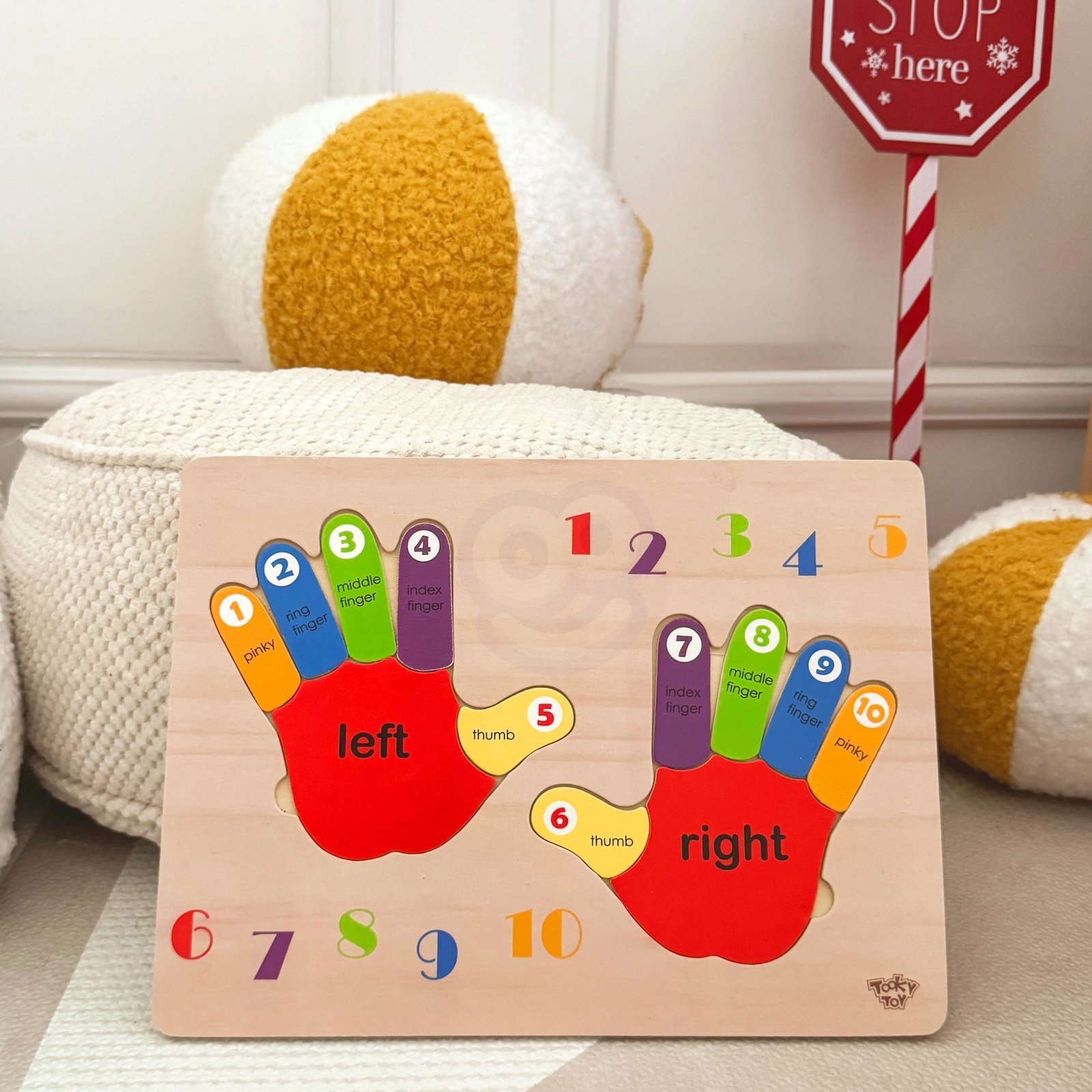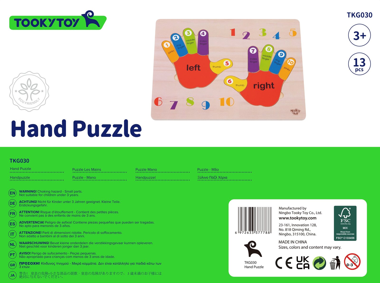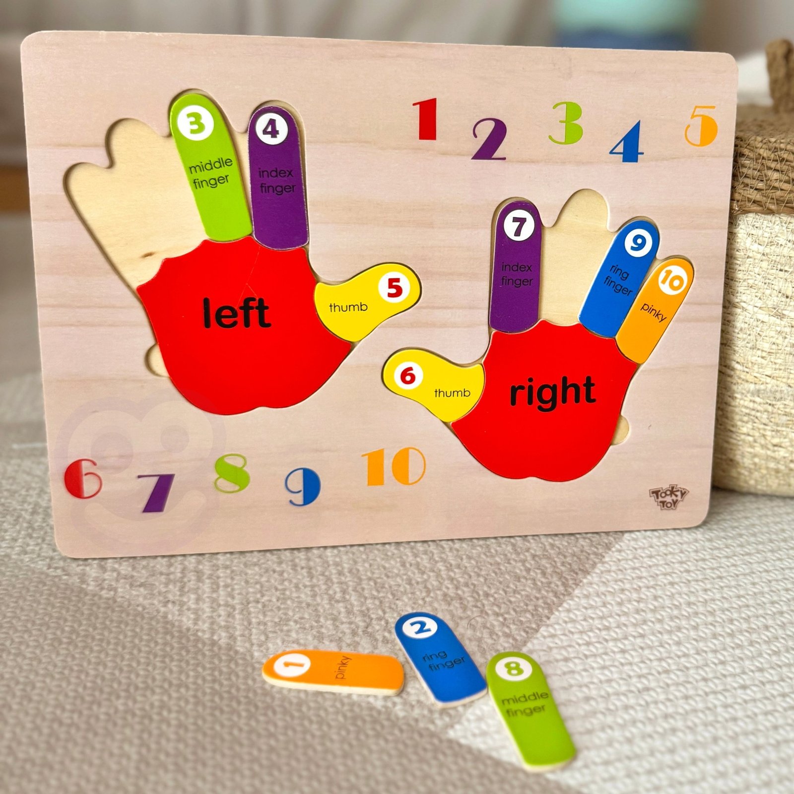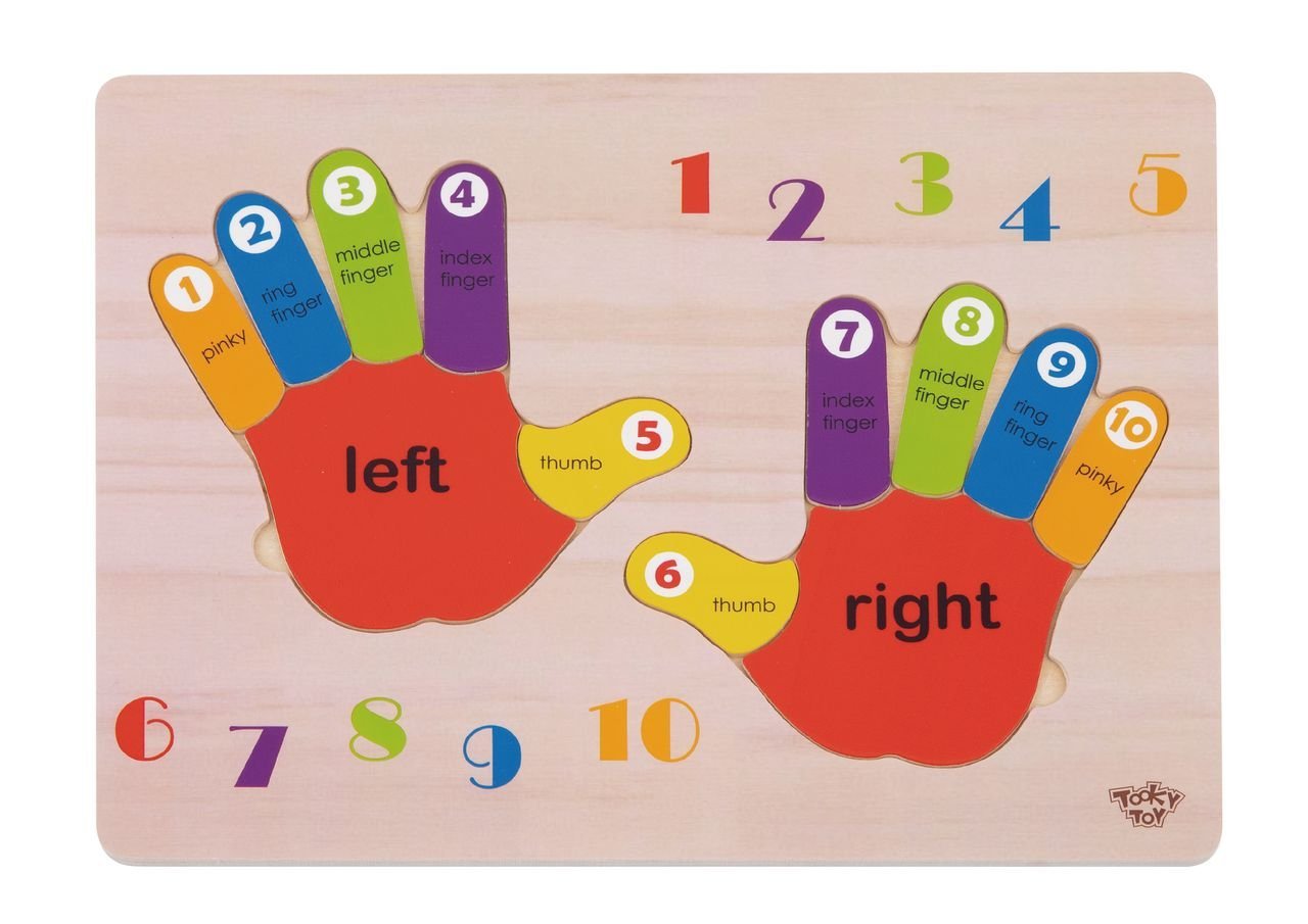 „TOOKY TOY“ medinė dėlionė „Rankytės“ – tai puiki mokomoji priemonė, skirta padėti vaikams mokytis skaičiuoti, atpažinti kairę ir dešinę rankas bei spalvas. Ji taip pat gali būti naudinga mokantis anglų kalbos.