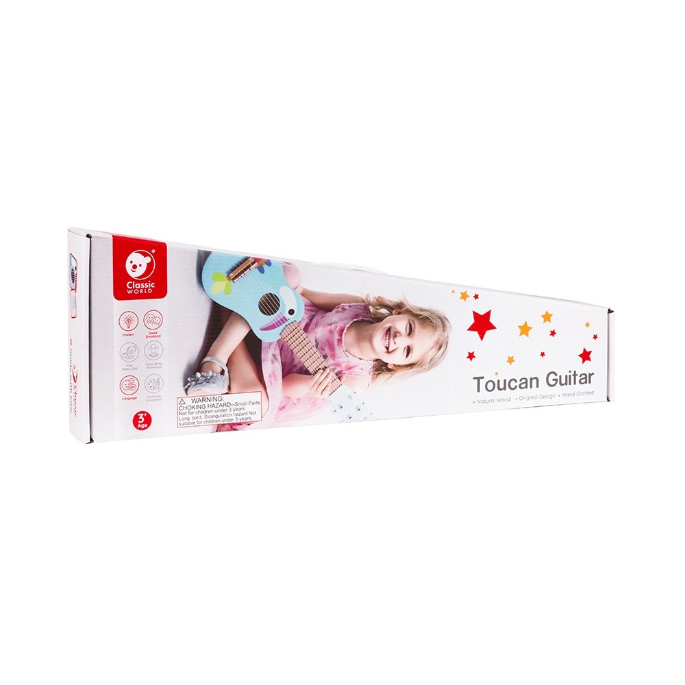 Ji išsiskiria ryškia mėlyna spalva ir žaismingu tukano raštu. Šis instrumentas padės mažiesiems išmokti pirmuosius akordus ir, pasitelkus šiek tiek kantrybės bei vaizduotės, surengti tikrą namų koncertą. Gitara padeda vaikams susipažinti su muzikos pasauliu ir atrasti pirmąsias muzikines aistras. Grodamas gitara, vaikas lavins rankų miklumą, mokysis susikaupimo ir ugdys ištvermę. Gitara puikiai imituoja tikrą instrumentą, todėl mokymasis tampa žaisminga patirtimi.