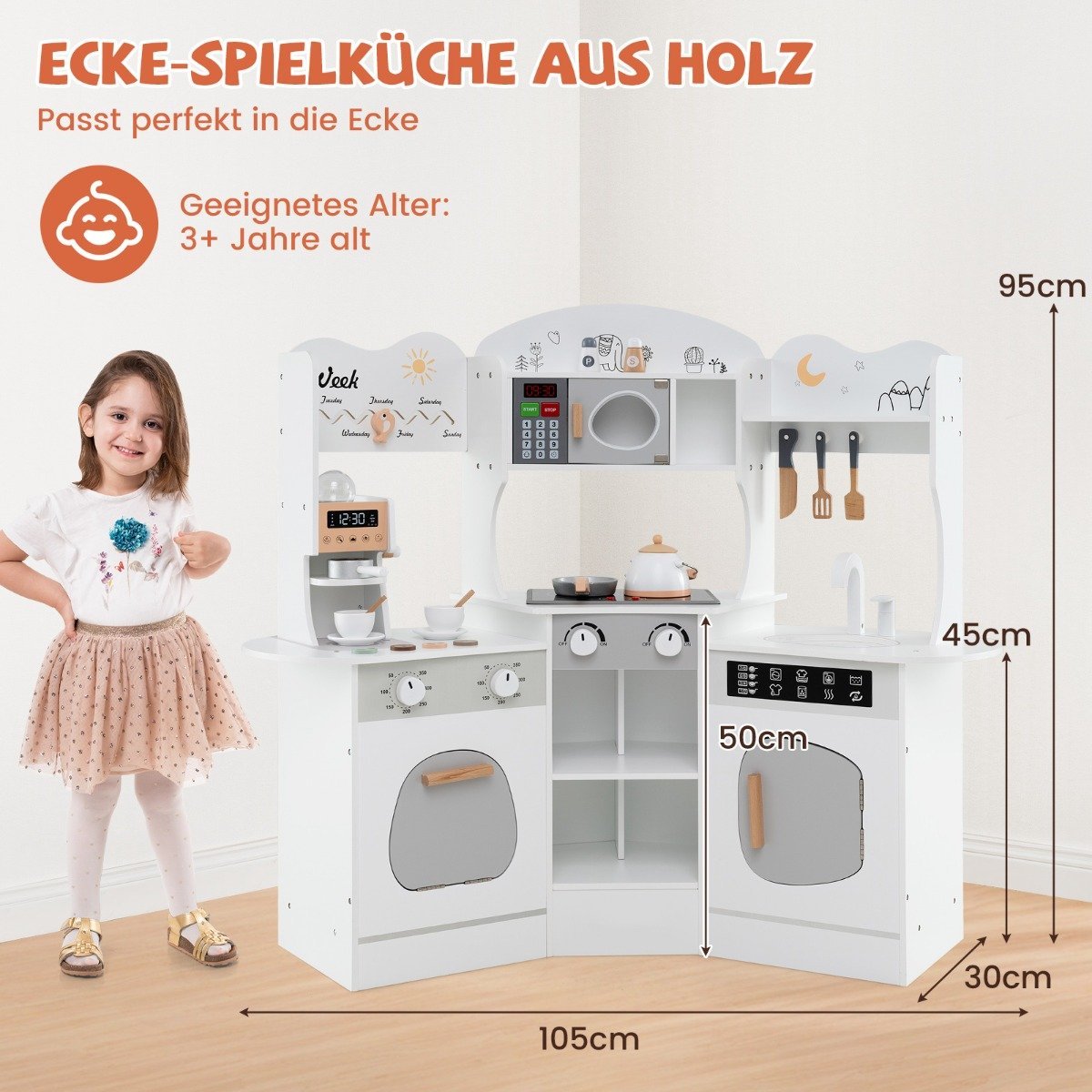 Leiskite savo vaikui pasinerti į kulinarinius nuotykius su mūsų kampine medine virtuvėle! Su integruota mikrobangų krosnele, viryklės plokštelėmis bei garso ir šviesų imitacija, žaidimas taps dar įdomesnis. Besisukiojantys rankenėlių ratai su „klik” garsu suteikia realistiškumo.