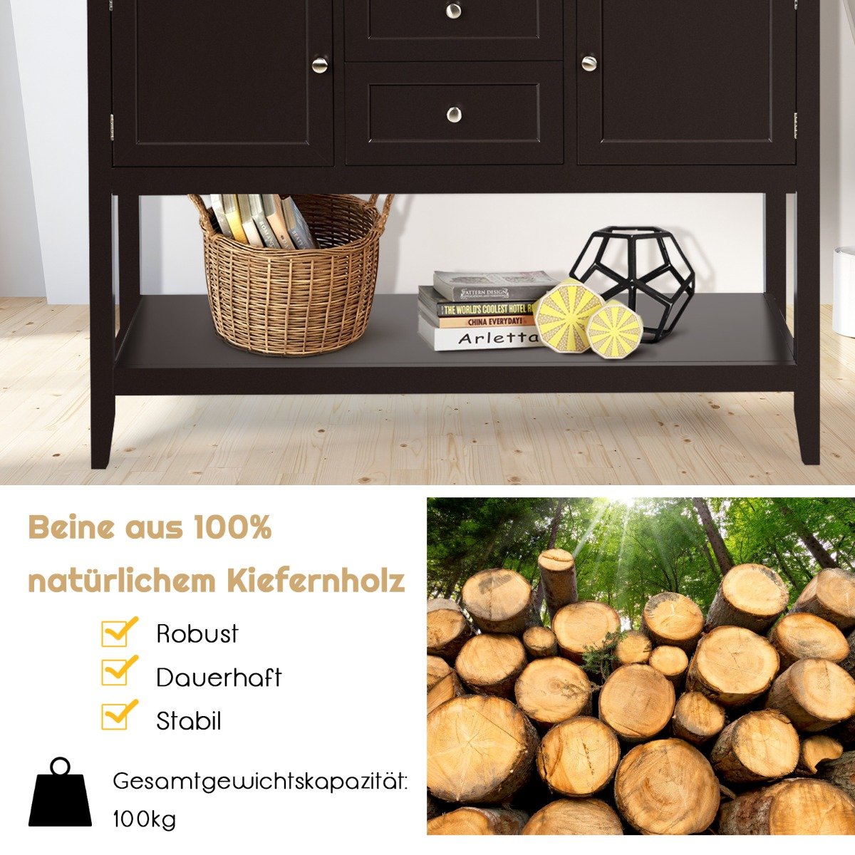 - Universalus panaudojimas – tinka kaip komoda, konsolinis staliukas, TV staliukas ar prieškambario baldas.