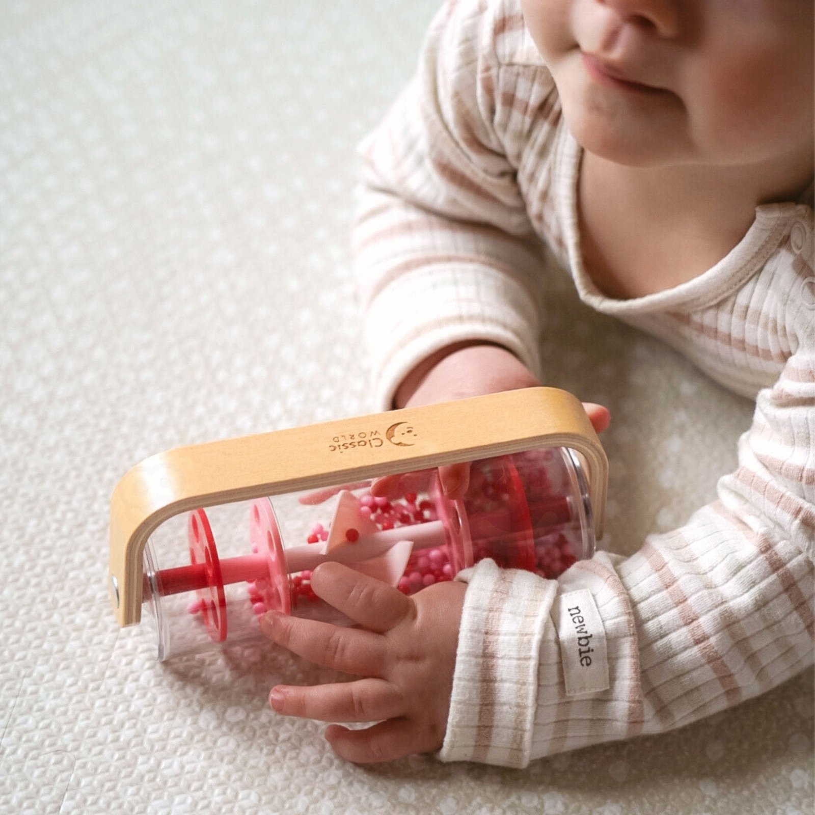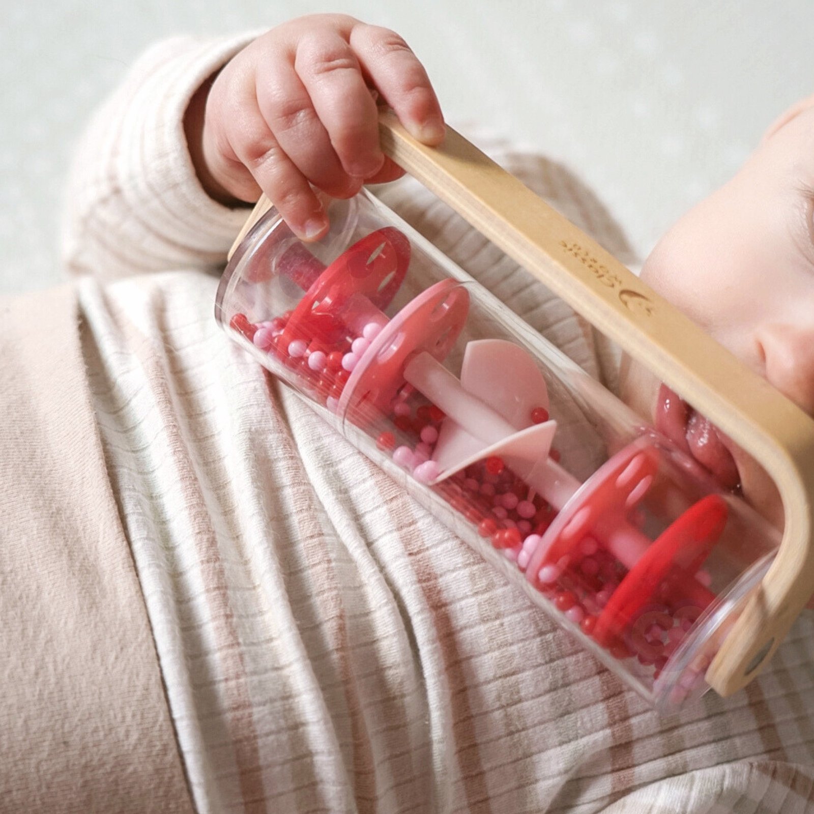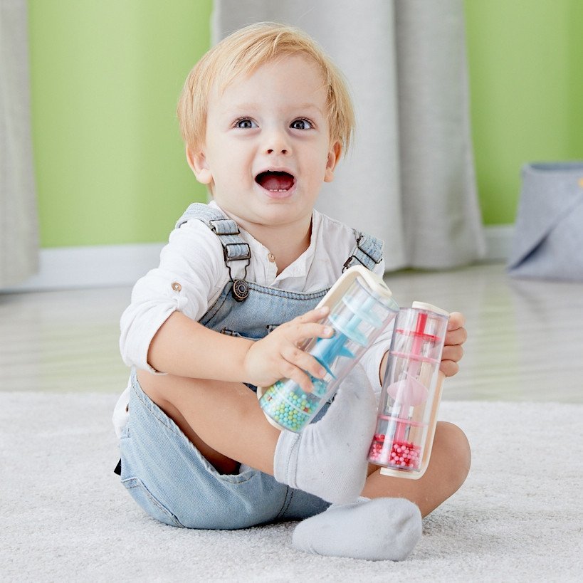 CLASSIC WORLD lietaus lazdelė, pagaminta iš medžio ir plastiko bei užpildyta raudonais kamuoliukais, skleidžia raminantį krintančio lietaus garsą. Pakratykite, pasukite ar apverskite ją ir stebėkite, kaip kamuoliukai krinta žemyn. Greitu mostu šis žaislas gali virsti barškučiu, kuris sukasi 360 laipsnių kampu. Lazdelė puikiai tinka jutiminiams įgūdžiams lavinti ir gali būti naudojama ritminiams užsiėmimams.