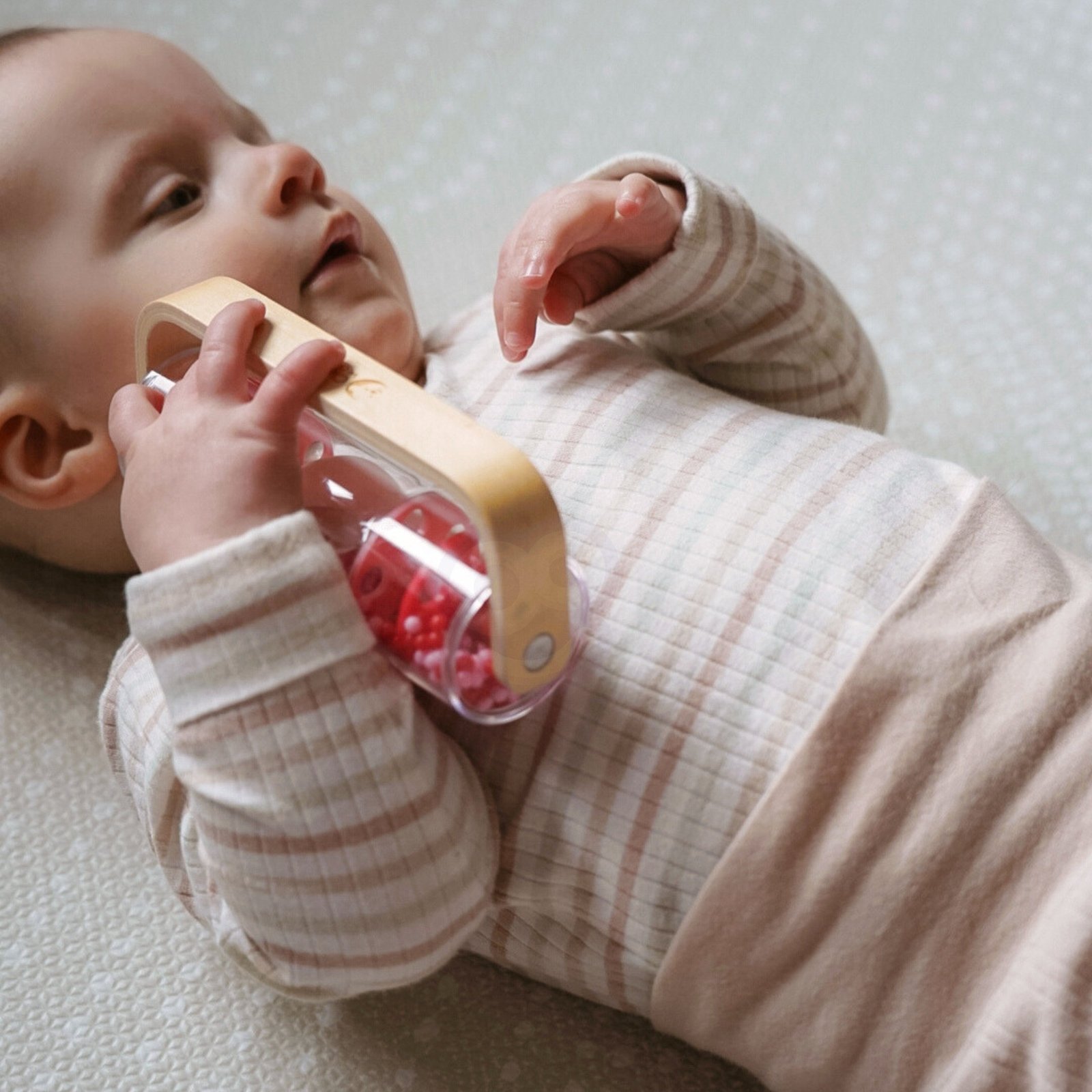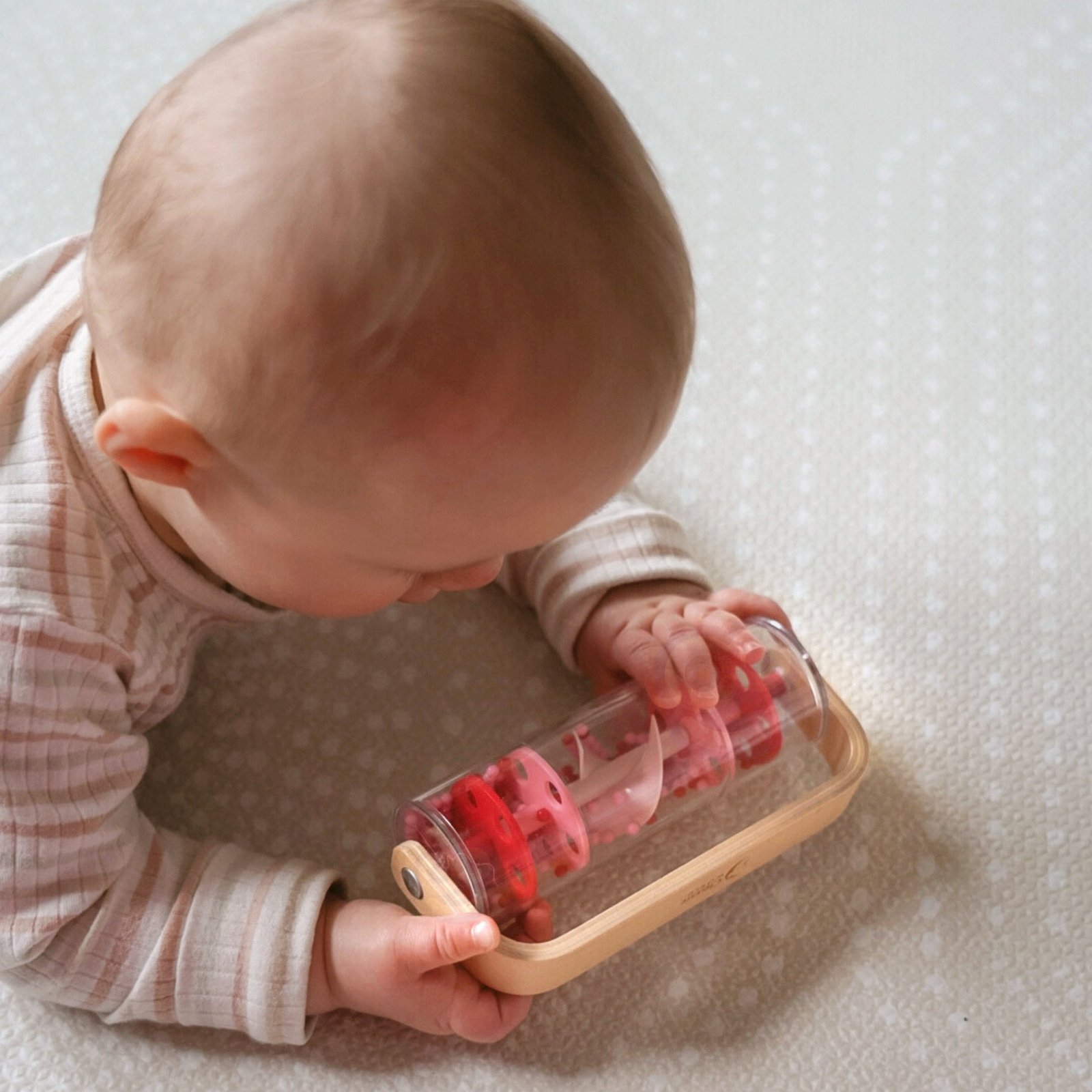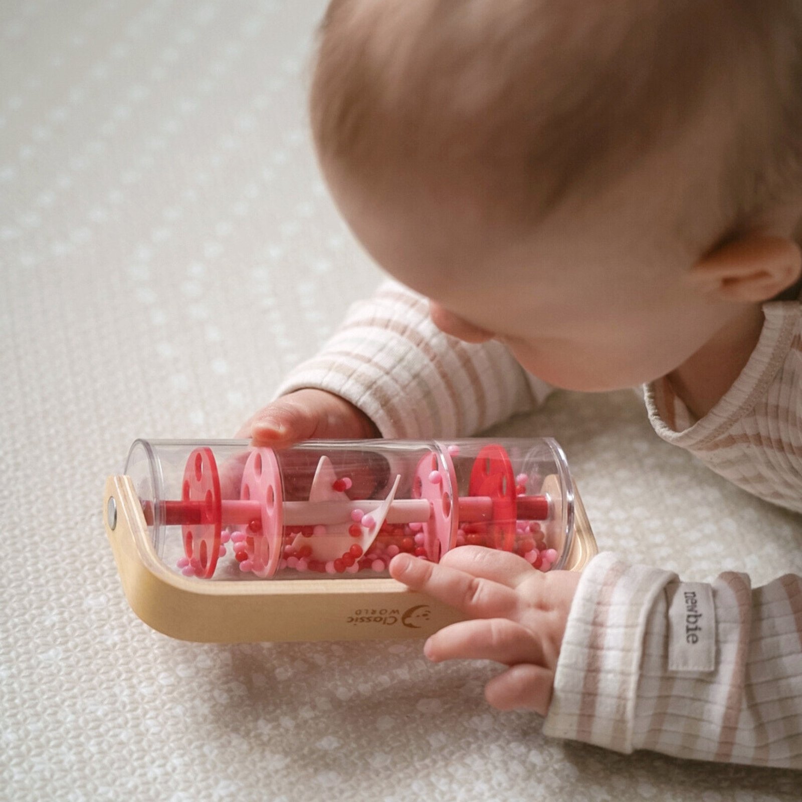 CLASSIC WORLD lietaus lazdelė, pagaminta iš medžio ir plastiko bei užpildyta raudonais kamuoliukais, skleidžia raminantį krintančio lietaus garsą. Pakratykite, pasukite ar apverskite ją ir stebėkite, kaip kamuoliukai krinta žemyn. Greitu mostu šis žaislas gali virsti barškučiu, kuris sukasi 360 laipsnių kampu. Lazdelė puikiai tinka jutiminiams įgūdžiams lavinti ir gali būti naudojama ritminiams užsiėmimams.