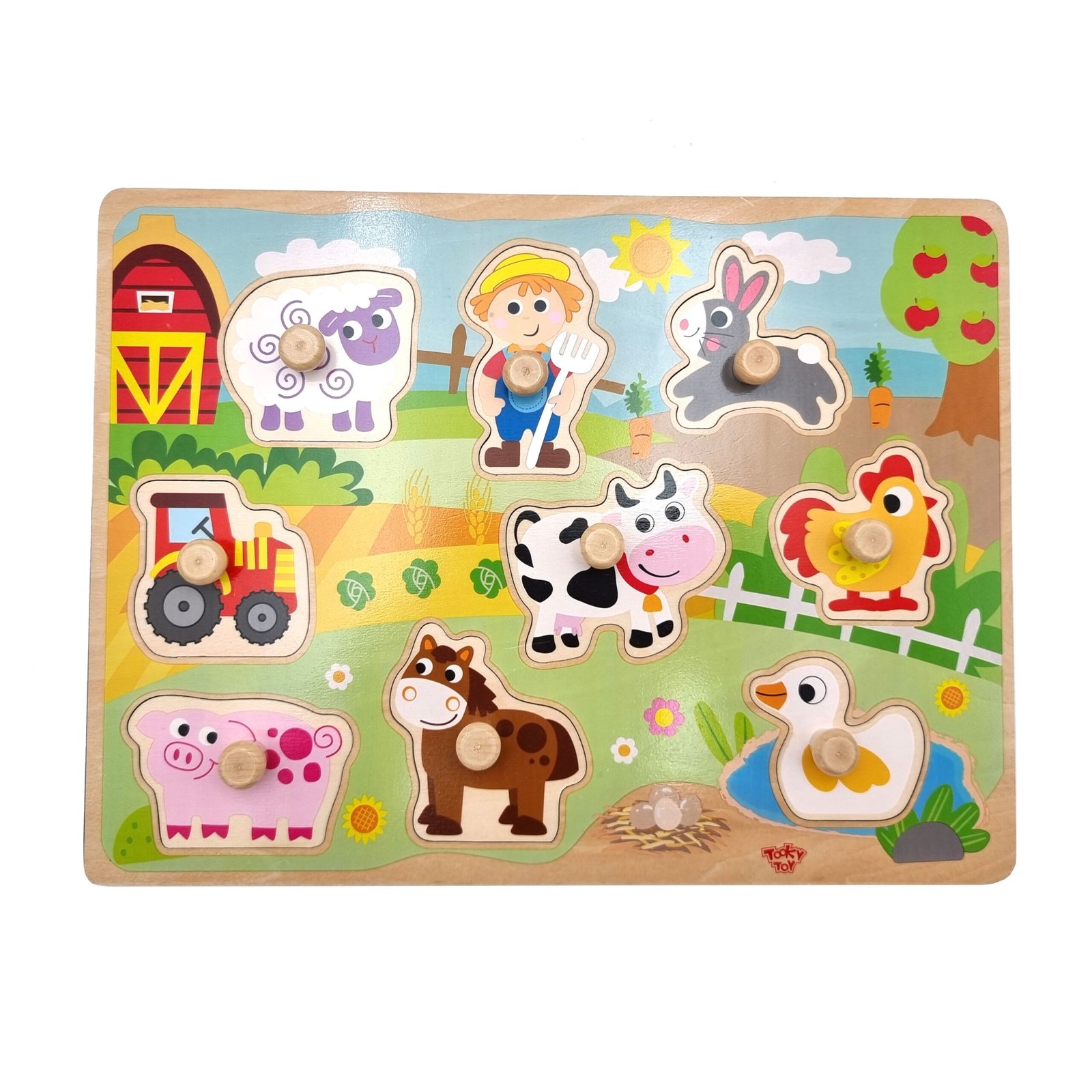 - Rinkinį sudaro medinė lenta su išfrezuotomis formomis ir 9 ūkio elementus vaizduojančios detalės su patogiomis rankenėlėmis.