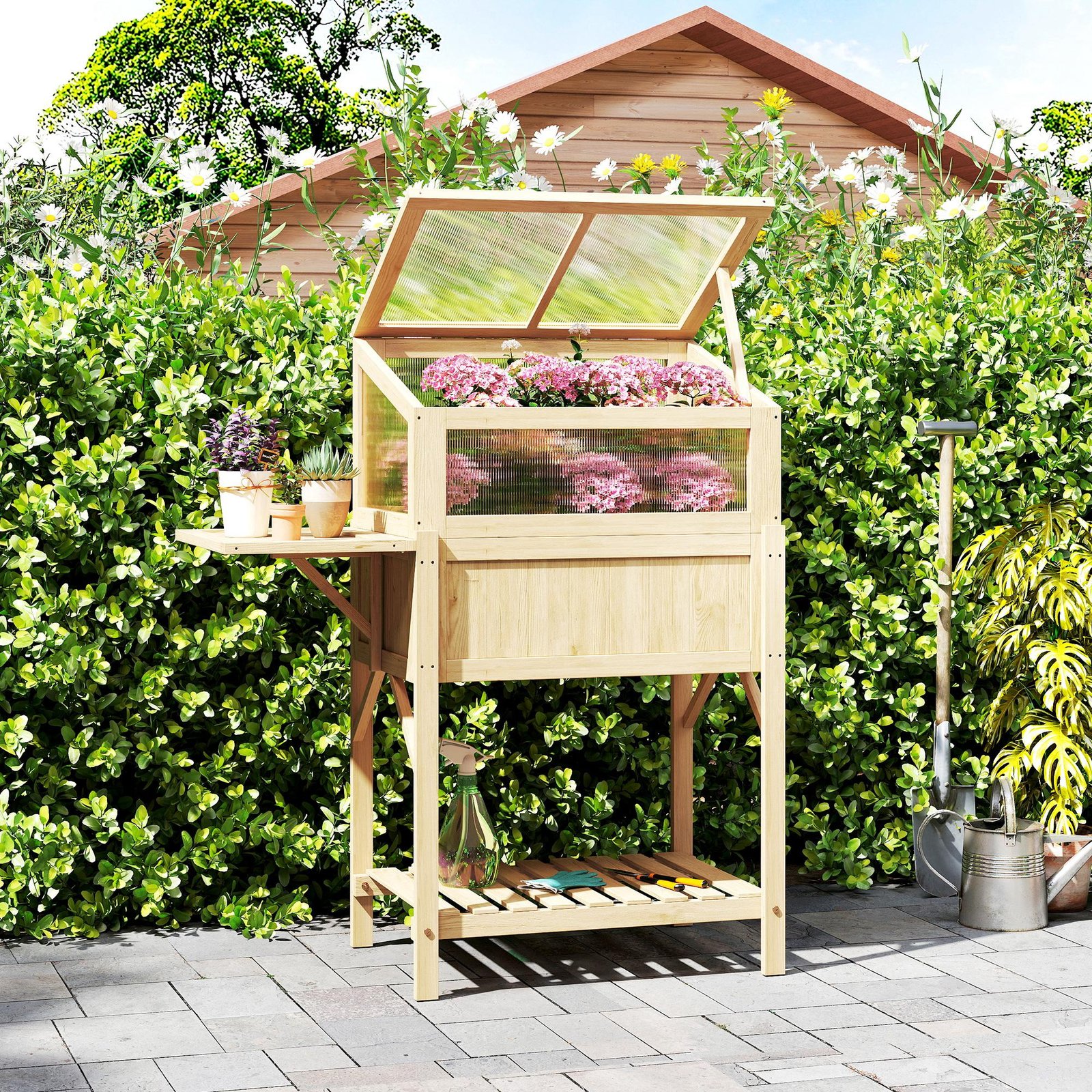 Medinė paaukštinta lysvė su daigykla ir atlenkiamu šoniniu staliuku