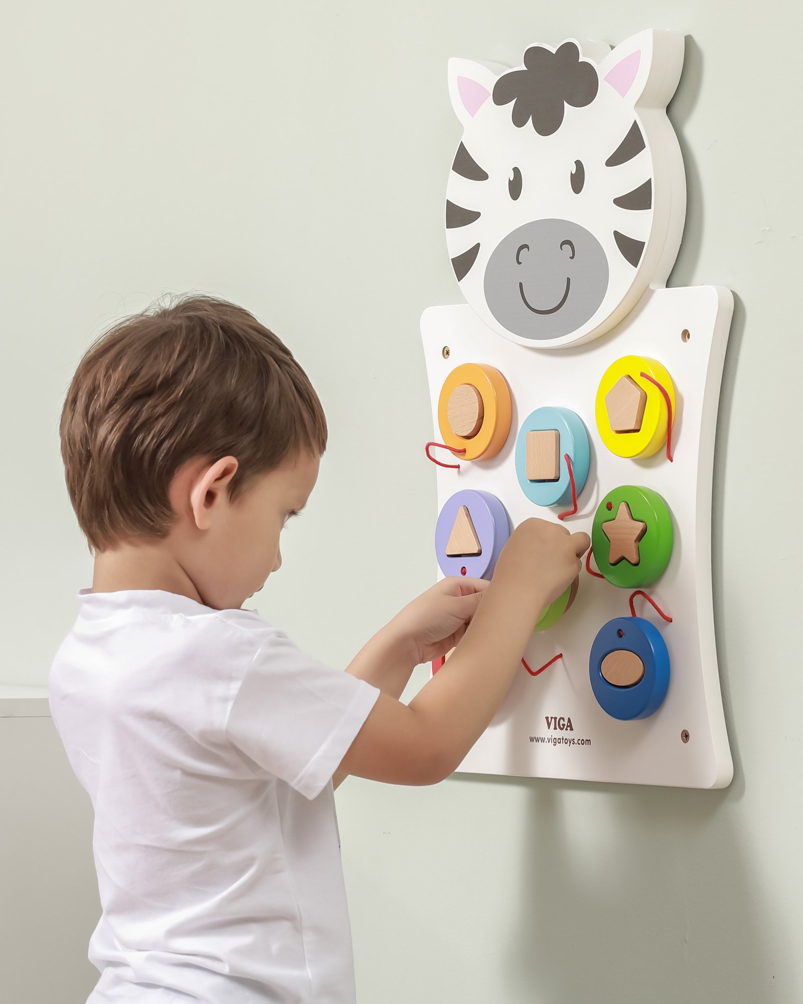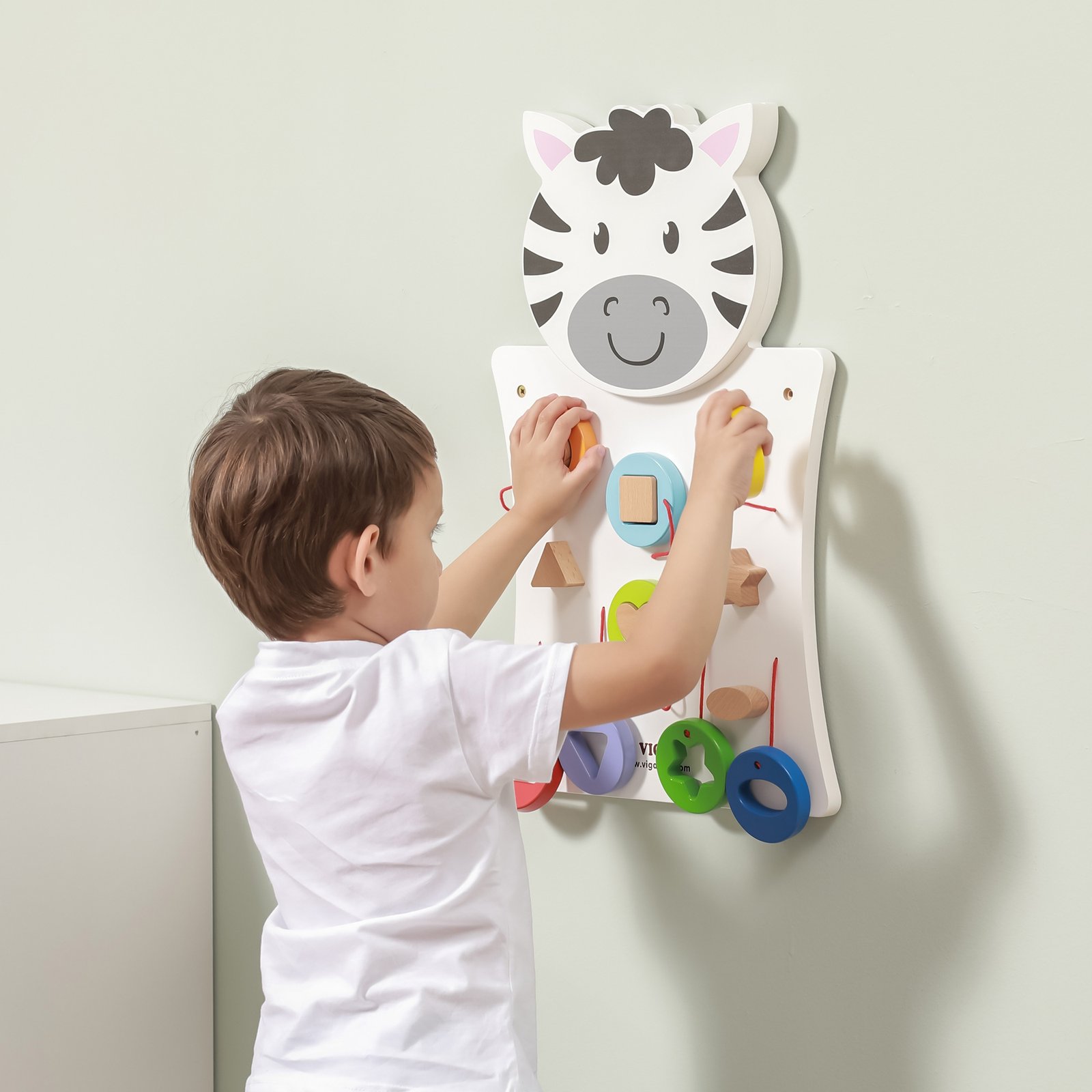 VIGA medinė manipuliacinė lentelė su zebro motyvu kviečia vaiką pasinerti į įdomų ir kūrybišką žaidimų pasaulį. Šis žaislas, sukurtas remiantis Montessori principais, veikia kaip formų rūšiuoklis. Lentelėje yra mediniai kaiščiai, ant kurių dedamos atitinkamų formų kaladėlės, pritvirtintos virvelėmis. Šis žaidimas ne tik įtrauks vaiką į įdomią veiklą, bet ir lavins spalvų bei formų atpažinimo įgūdžius, vaizduotę ir loginį mąstymą. Lentelė pagaminta iš tvarios, FSC sertifikuotos medienos. Ji nulakuota ir nudažyta ryškiomis, vaikams saugiomis spalvomis.