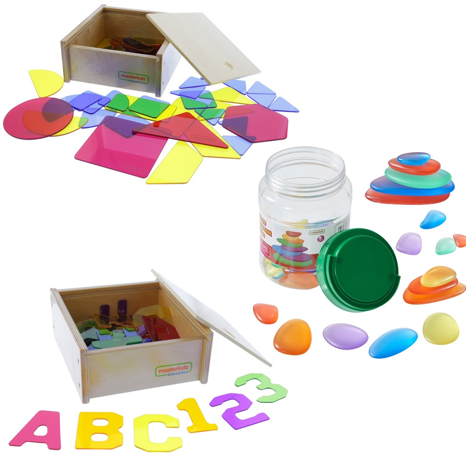 „Masterkidz“ sensorinė LED šviesos dėžė – tai tvirta medinė dėžė su LED apšvietimu, skleidžiančiu baltą šviesą. Ji skirta įvairioms kūrybiškumą lavinančioms veikloms, pavyzdžiui, spalvų maišymui ar mokymuisi taikant STEM metodiką. Dėžė leidžia stebėti, kaip šviesa sklinda pro įvairias medžiagas – lapus, popierių, padėkliuką su smėliu ar skaidrų vandenį, kuriant vizualiai patrauklius efektus. Ji puikiai suderinama su rinkinyje esančiais spalvotais priedais, kurie praplečia žaidimo ir mokymosi galimybes, leidžiant kurti įvairius raštus ir kompozicijas šviesoje.