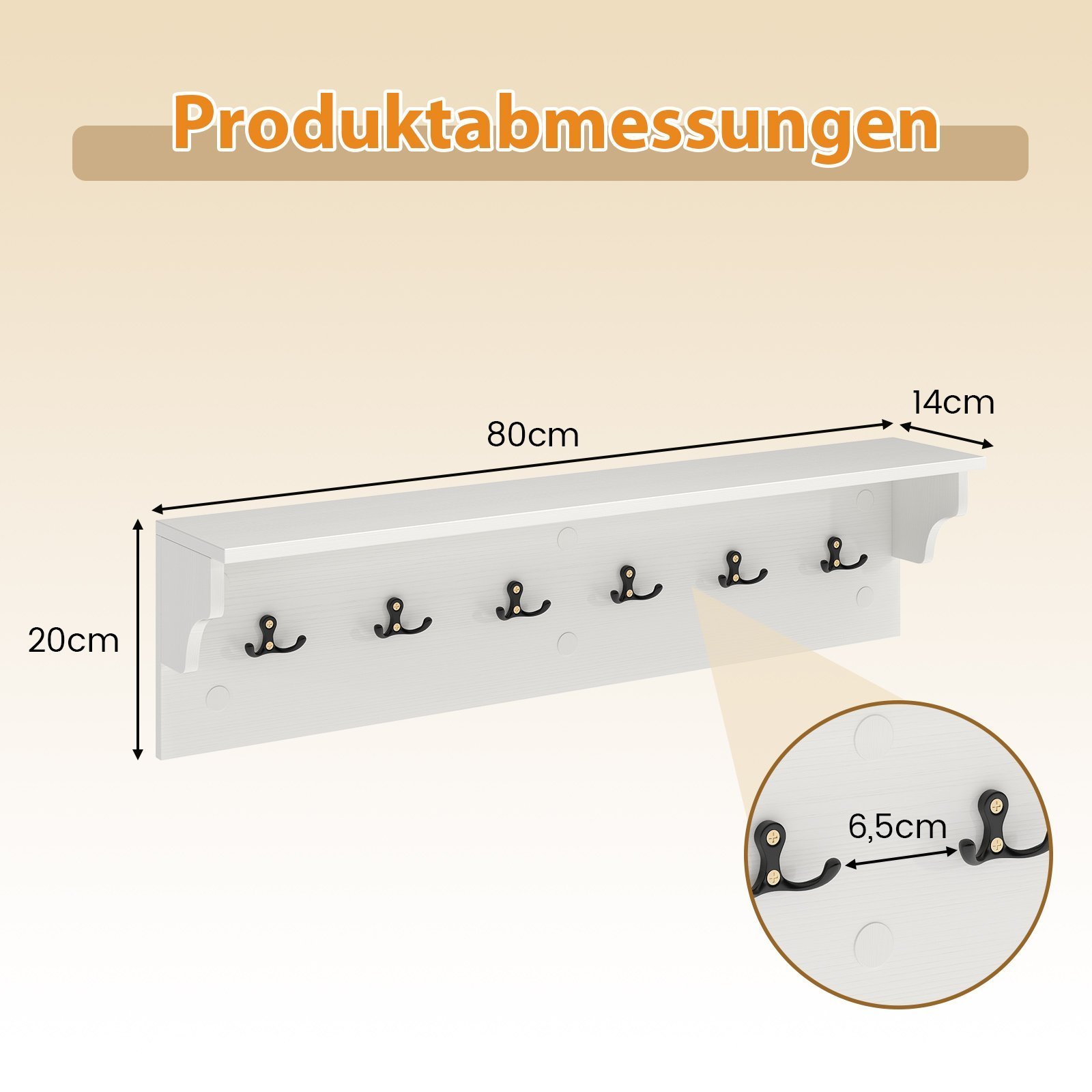 Medinė sieninė kabykla su lentyna ir 6 kabliukais (Balta)