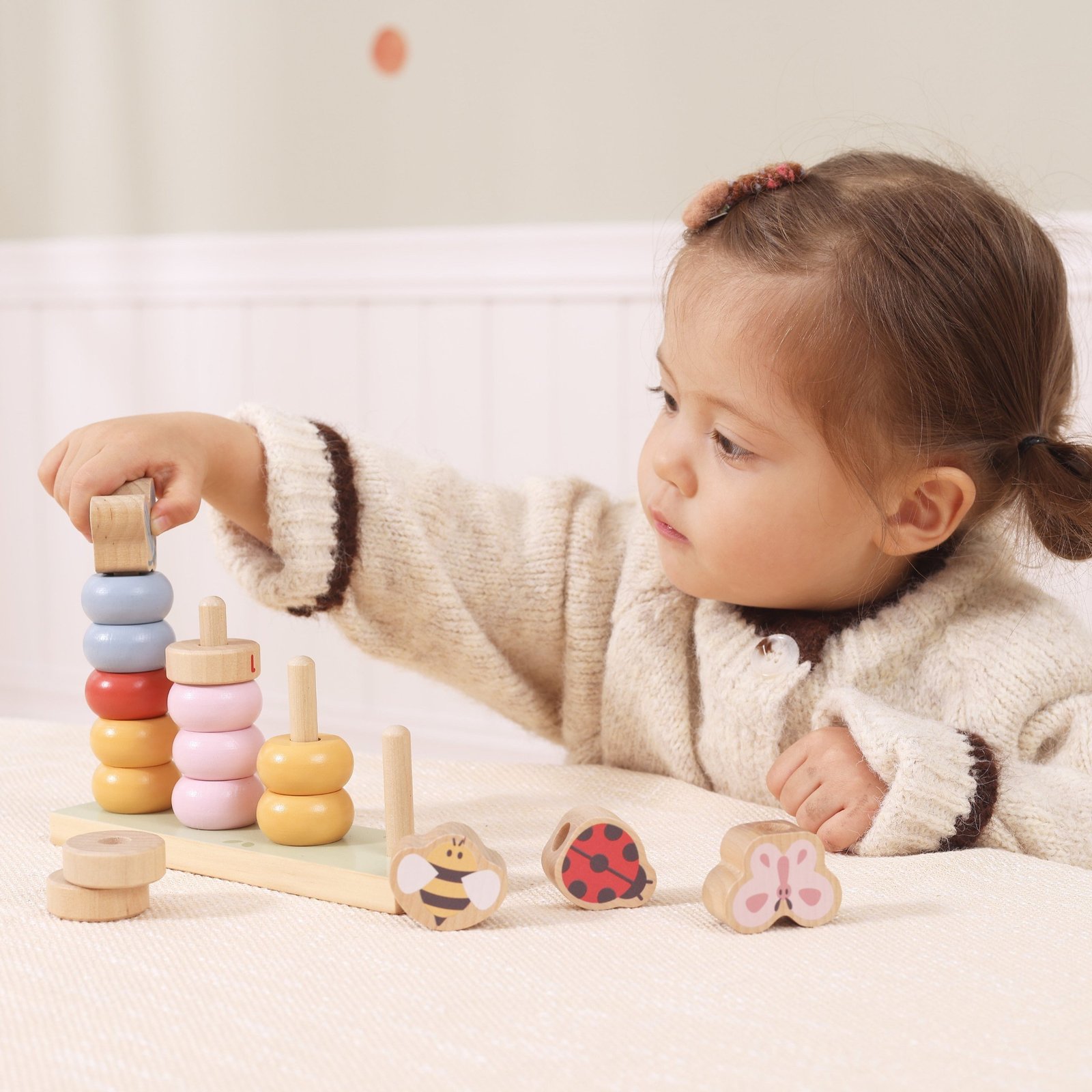 Medinė pavasario dėlionė – smagus ir lavinantis žaislas, padėsiantis vaikui natūraliai susipažinti su skaičiais ir loginio mąstymo principais. Spalvingi elementai su draugiškais vabaliukų motyvais skatina mažylį dėlioti, rūšiuoti ir eksperimentuoti. Žaidimo metu elementai dedami ant pagaliukų, derinant juos pagal spalvas, dydžius ir skaičius. Taip vaikas mokosi veikdamas, savo tempu. Ši dėlionė puikiai tinka mokymuisi, lavinimui ir smagiai veiklai namuose, darželyje ar lopšelyje.