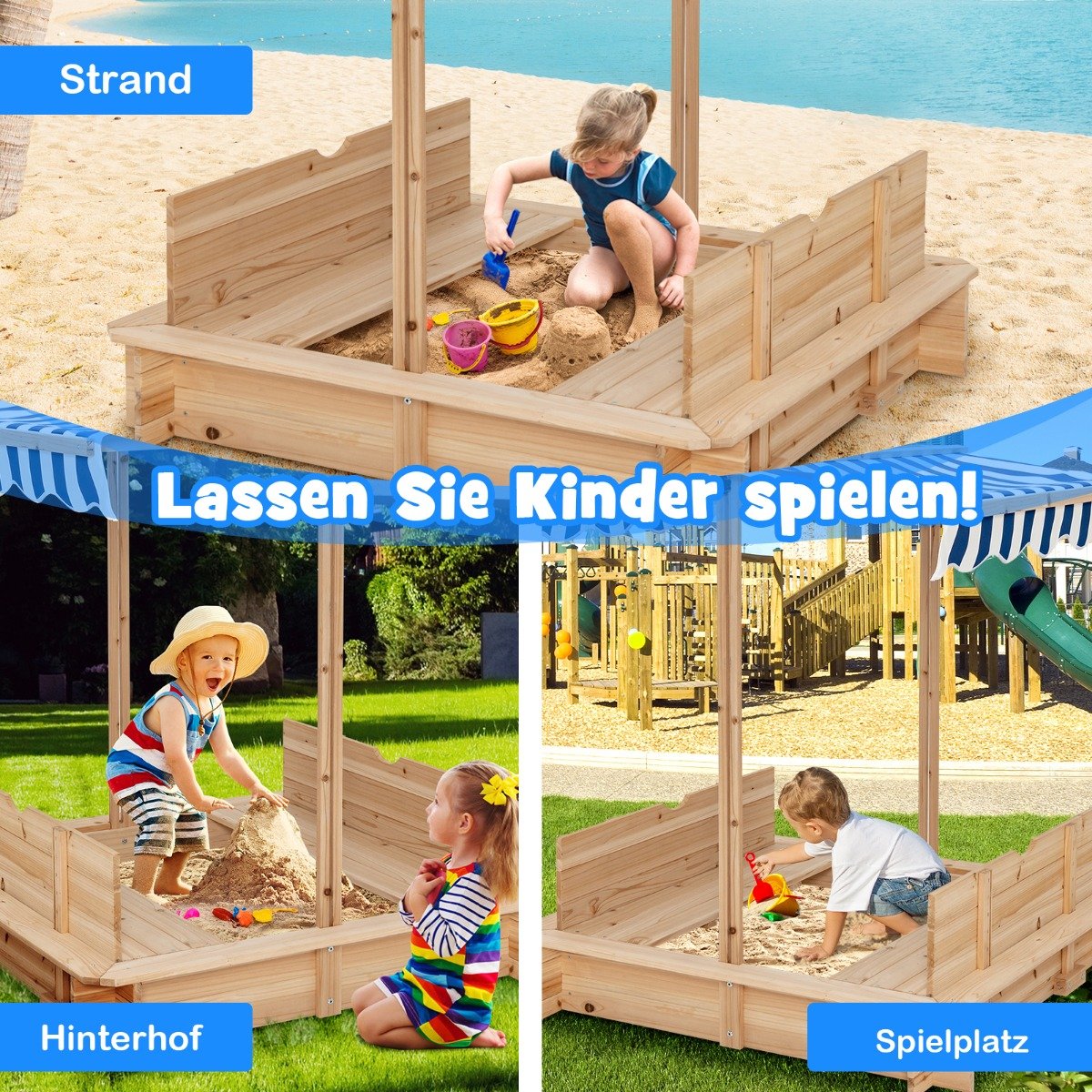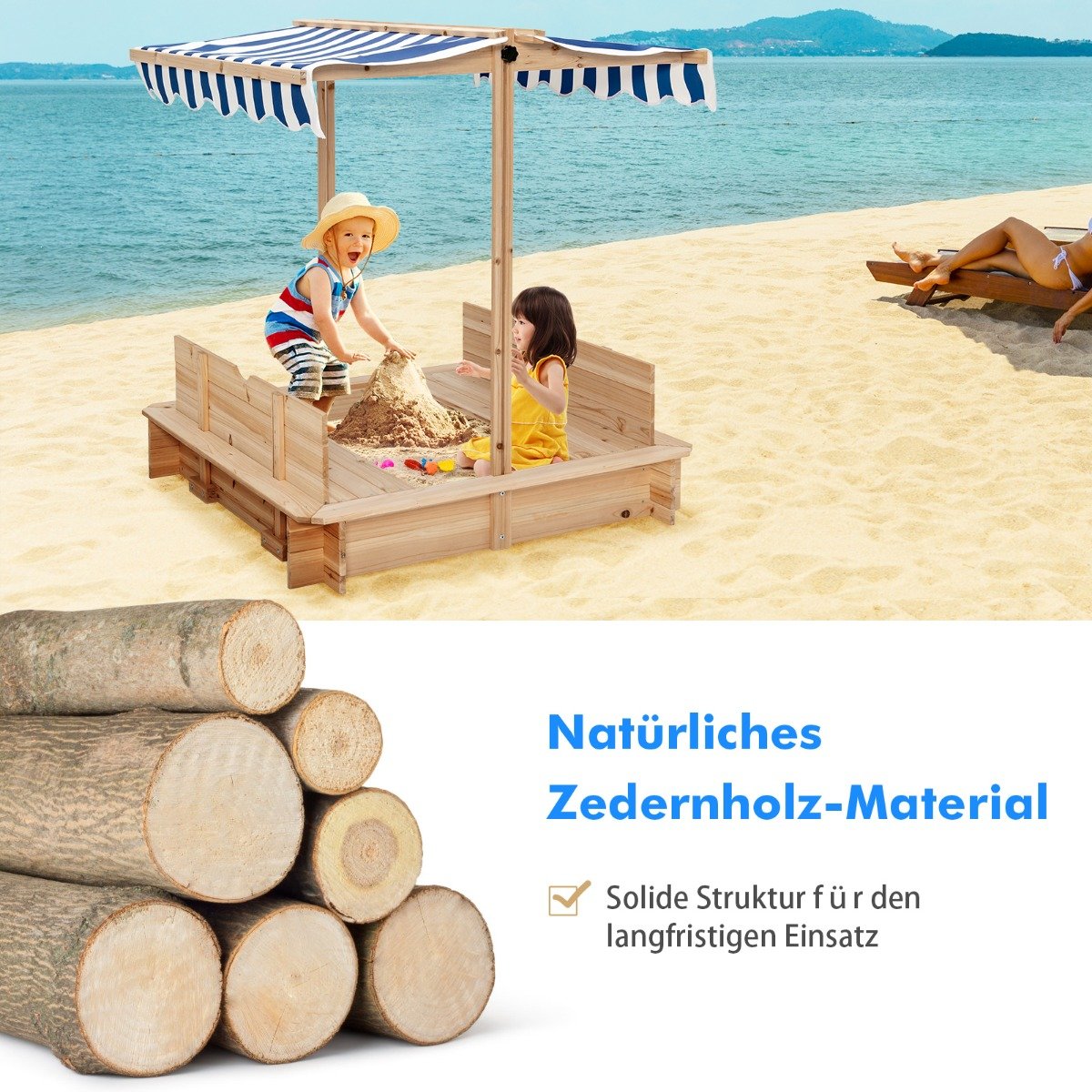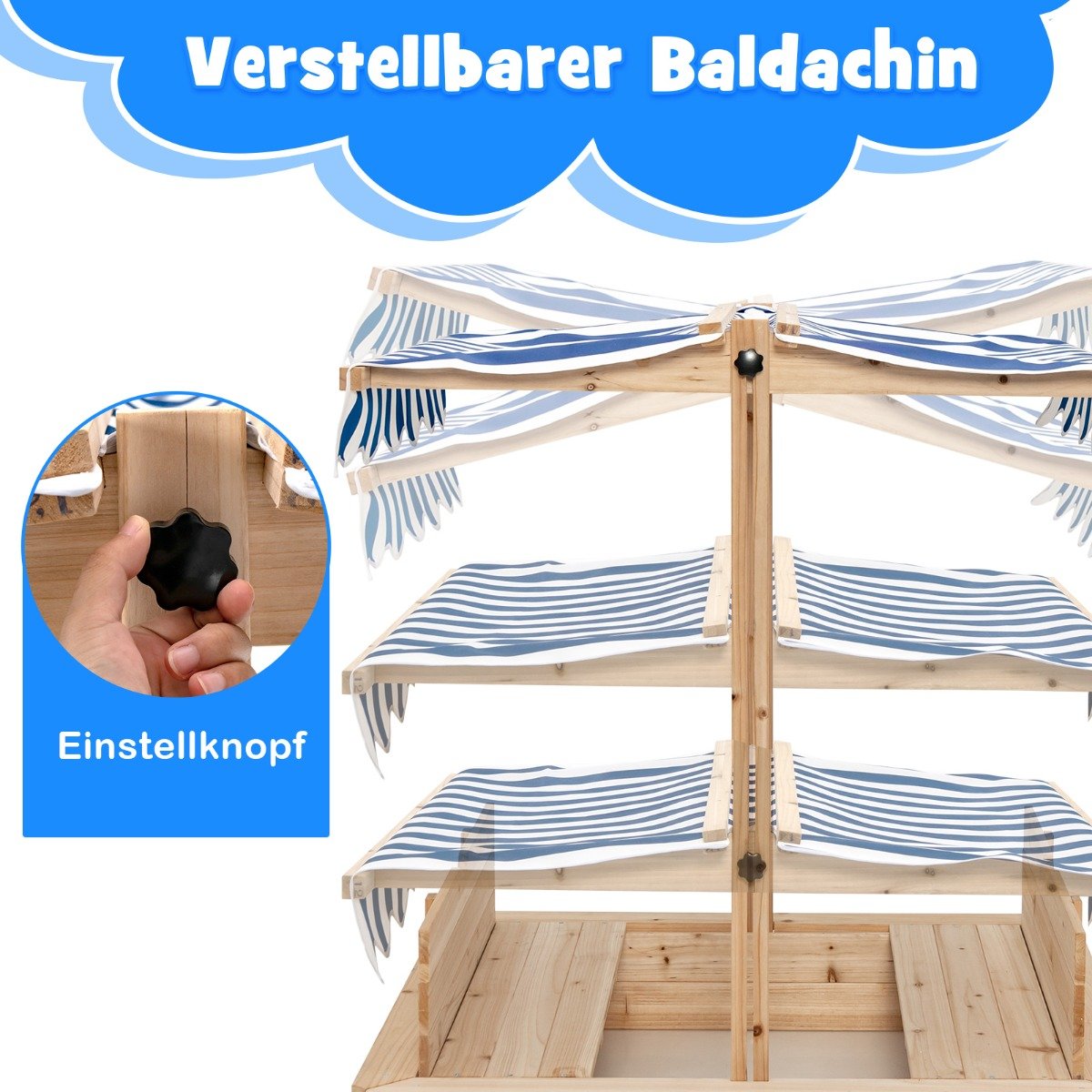 Medinė smėlio dėžė su suolais ir reguliuojamu stogeliu (Įvairiaspalvė)