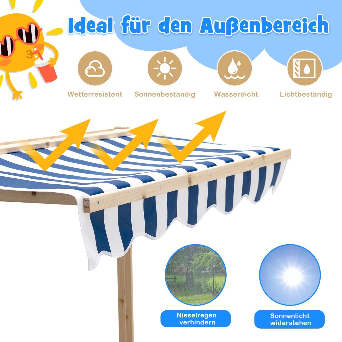 Dovanokite vaikams džiaugsmo ir pramogų su mūsų medine smėlio dėže! Ši smėlio dėžė, neturinti dugno, užtikrina puikų vėdinimą ir drenažą. Reguliuojamas stogelis apsaugo nuo saulės spindulių ir lengvo lietaus, o patogios suoliuko atramos suteikia vaikams poilsio vietą. Kai nesinaudojama, suolai lengvai transformuojami į apsauginį dangtį.