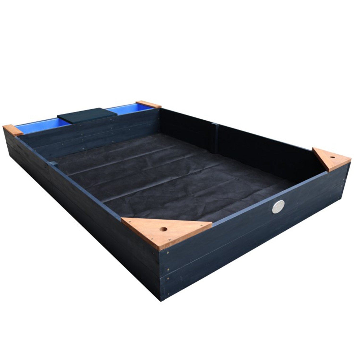 Medinė smėlio dėžė su talpyklomis, suoliuku-daiktadėže ir dangčiu