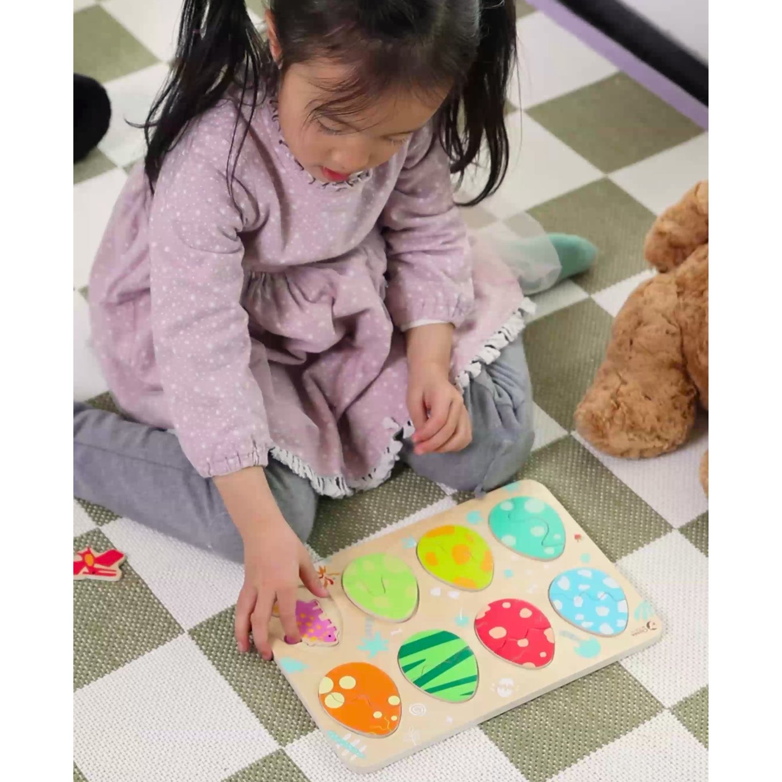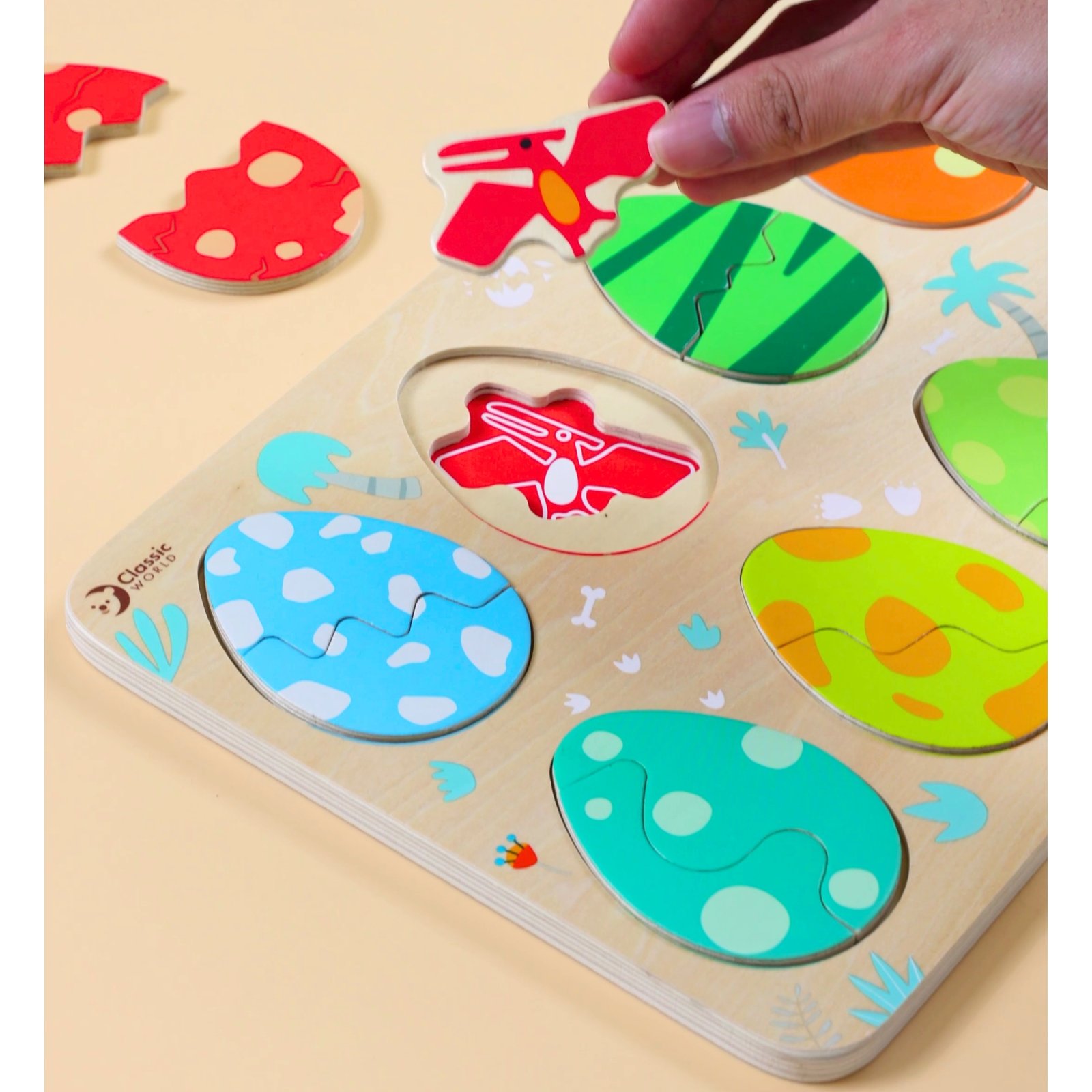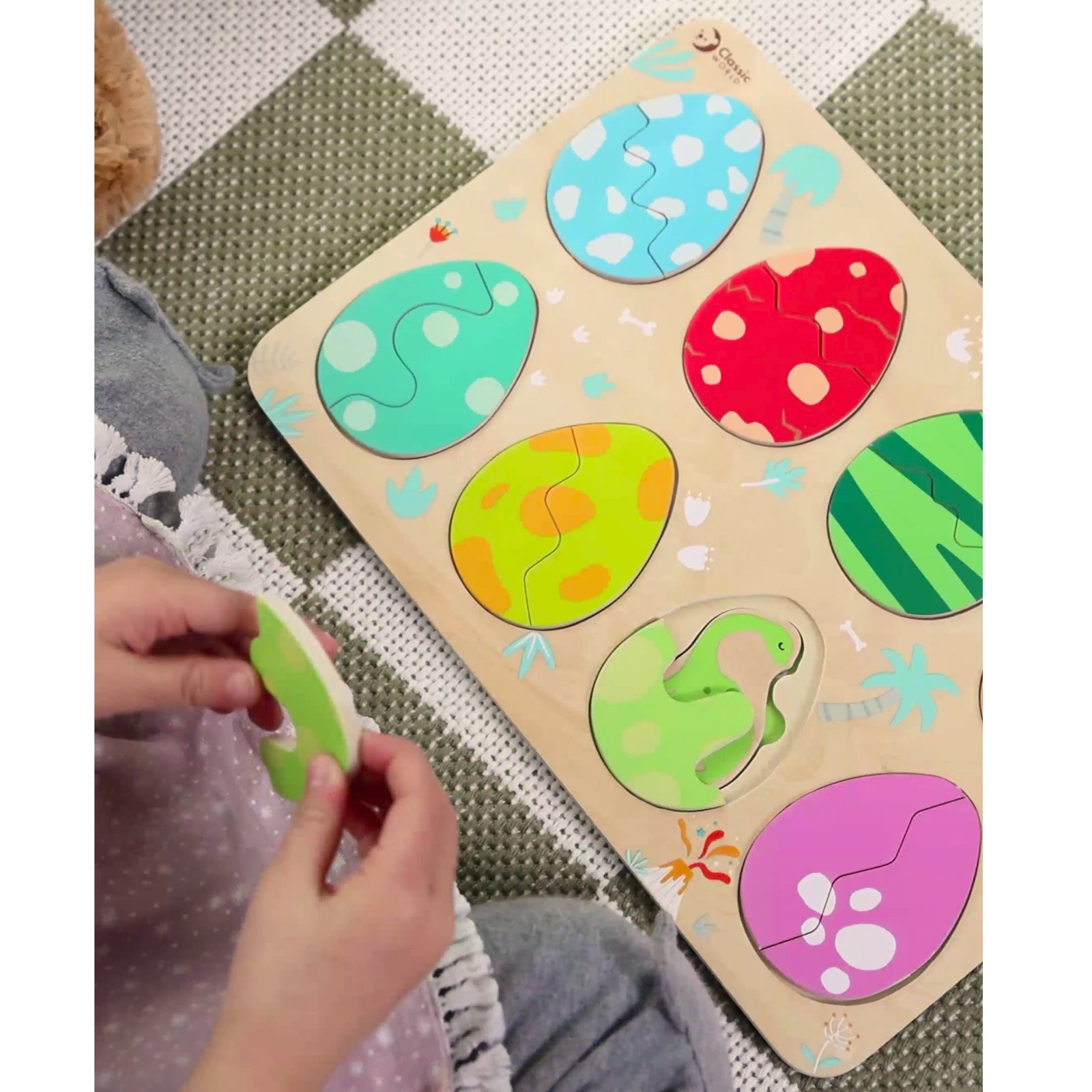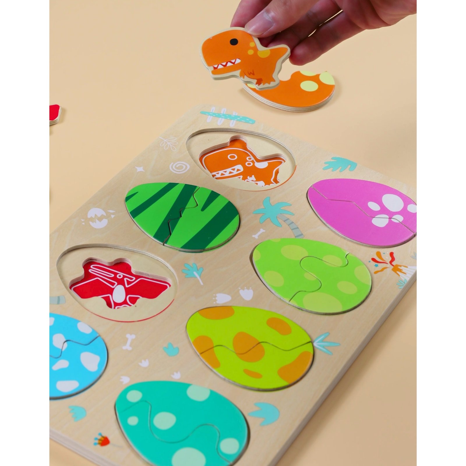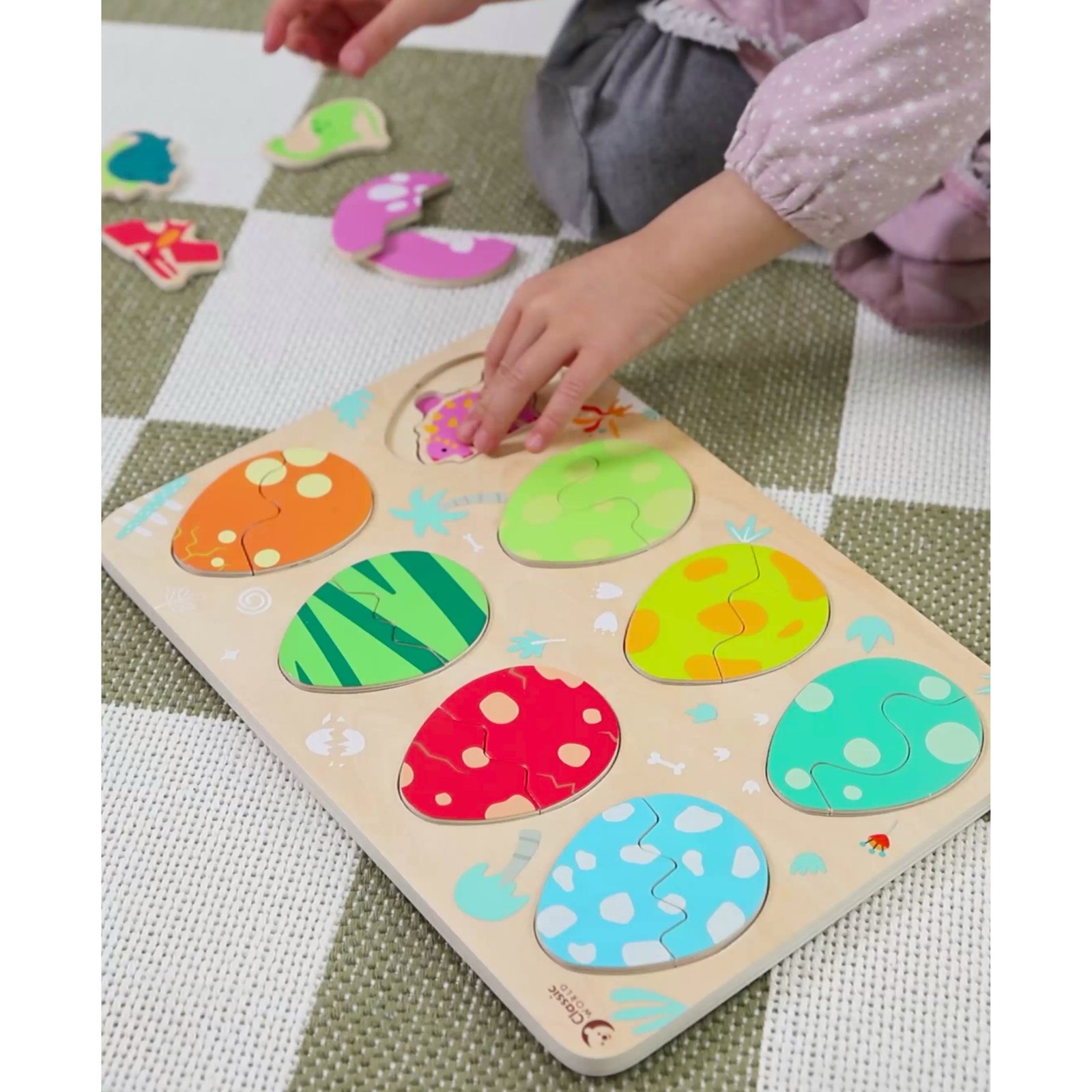 Mažiesiems tyrinėtojams nuo 18 mėnesių skirta medinė dinozaurų kiaušinių dėlionė kviečia leistis į priešistorinę kelionę. Ši trijų sluoksnių dėlionė sujungia dėliojimo pramogą su dinozaurų išsiritimo motyvu. Rinkinį sudaro 25 elementai: dinozaurų figūrėlės ir kiaušinių lukštų dalys, kurias reikia sujungti.