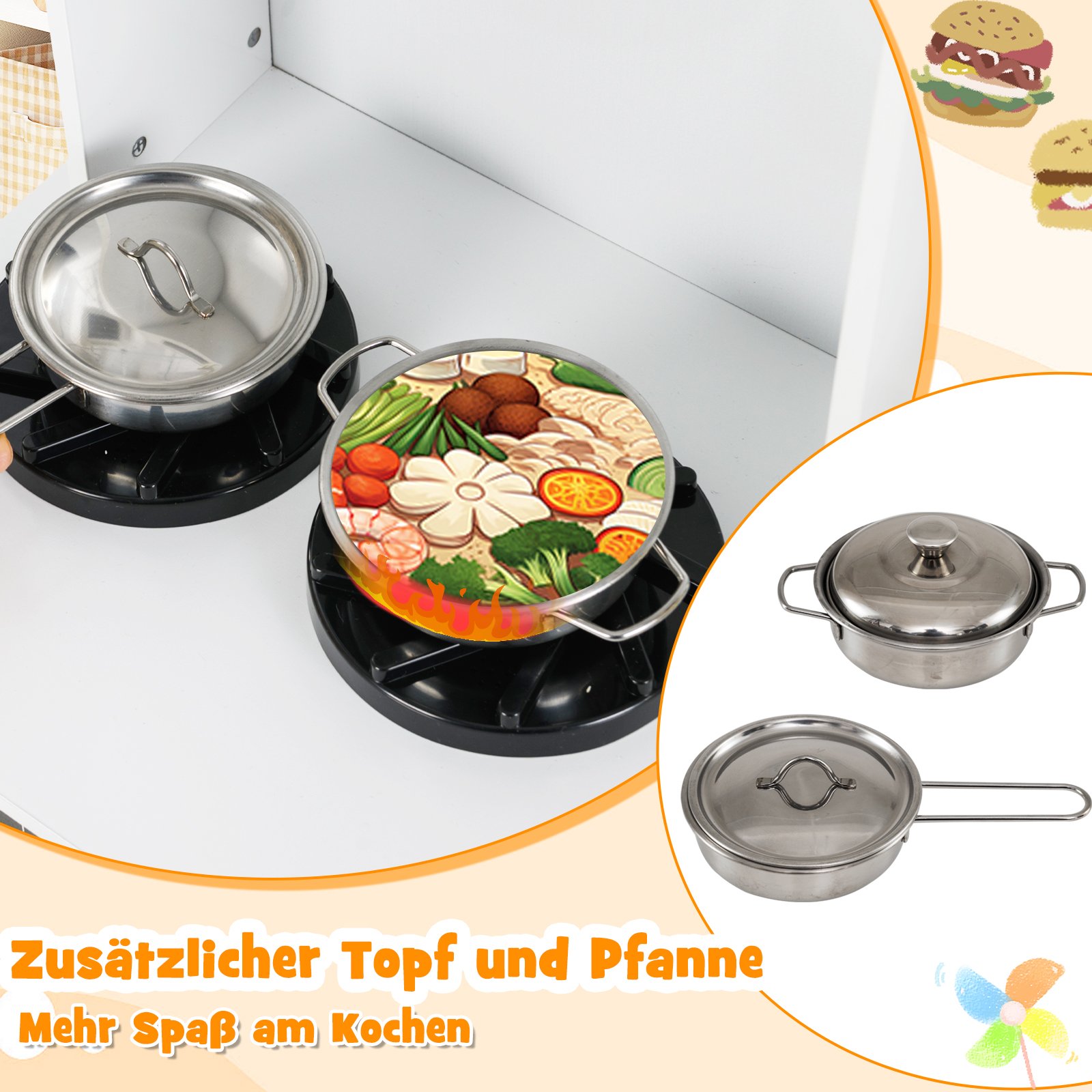- Papildomas nerūdijančio plieno puodų ir keptuvių rinkinys interaktyviam ir saugiam žaidimui.
