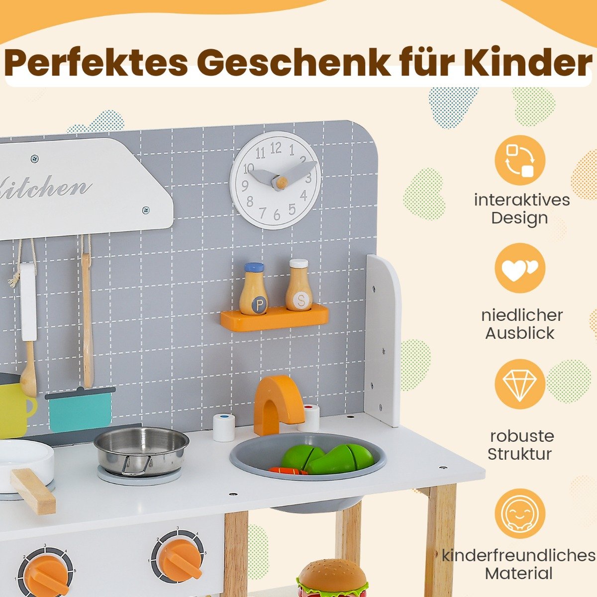 Leiskite jūsų vaikams pasijusti tikrais virtuvės šefais su šiuo interaktyviu, mediniu žaidimų virtuvėlės rinkiniu! Sukurtas su realistiškais elementais, jis skatina vaizduotę ir mokymąsi per žaidimą.