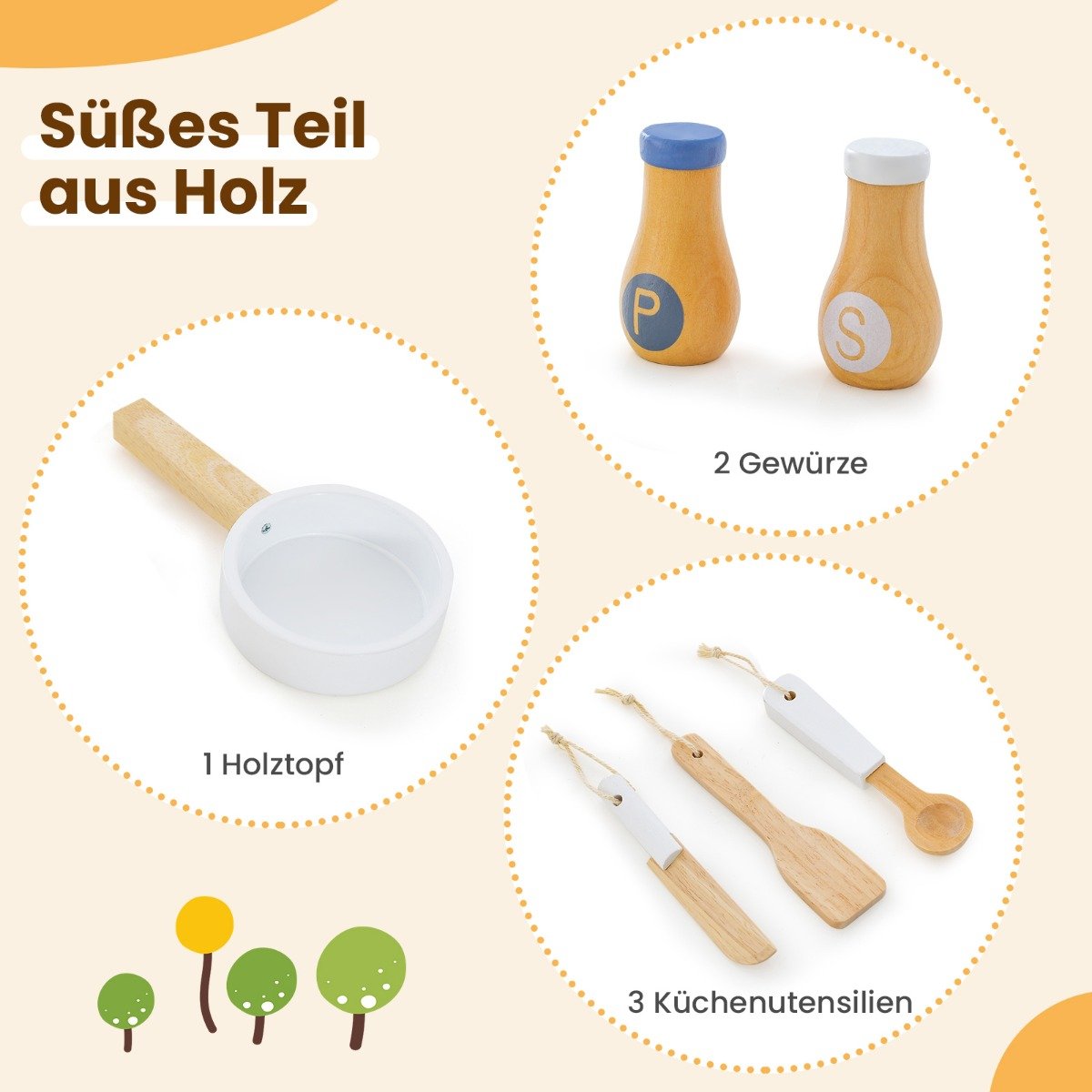 - Turtingas priedų komplektas: puodas, prieskonių indeliai ir virtuvės įrankiai.