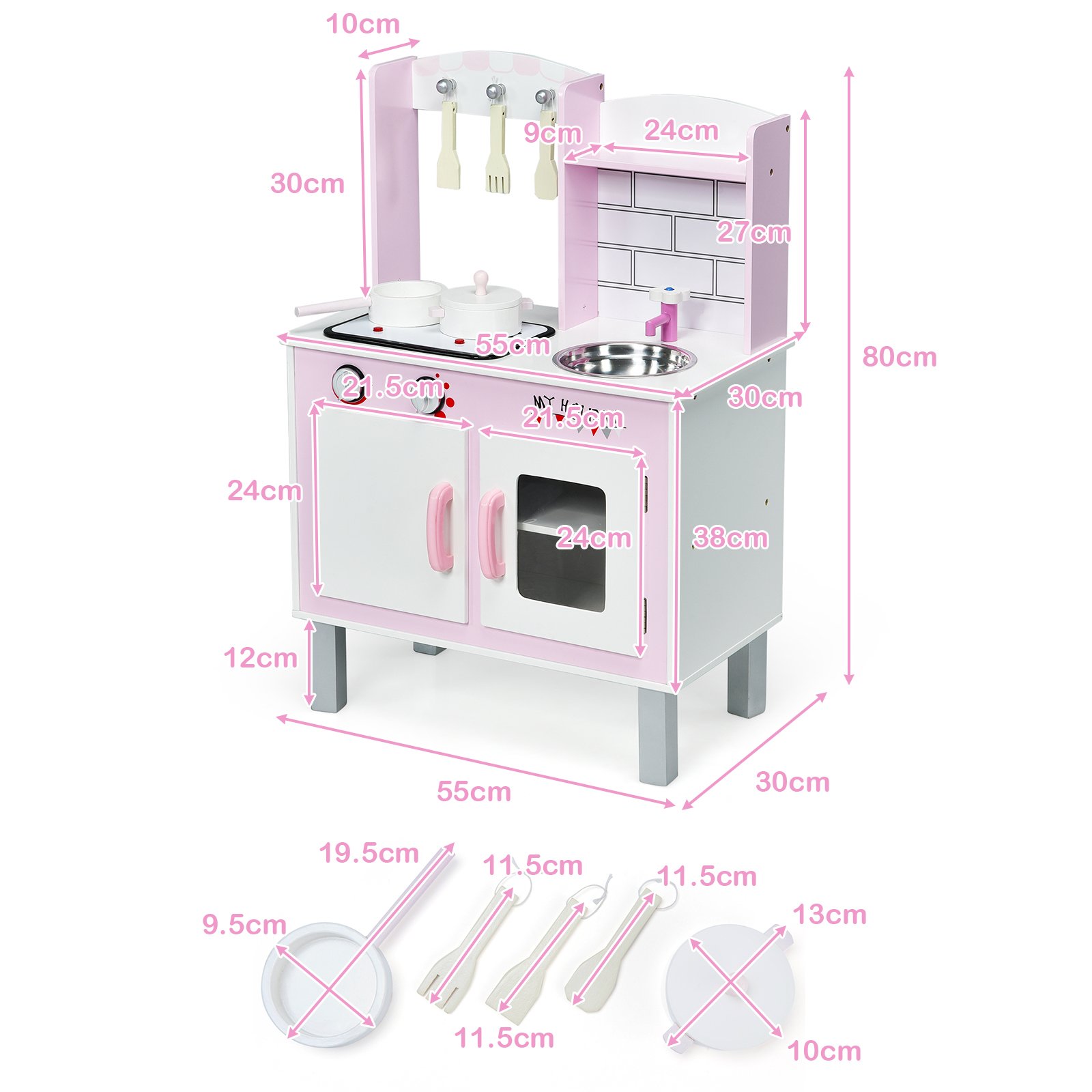 Medinė virtuvėlė su priedais 55x30x80 cm (Rožinė)