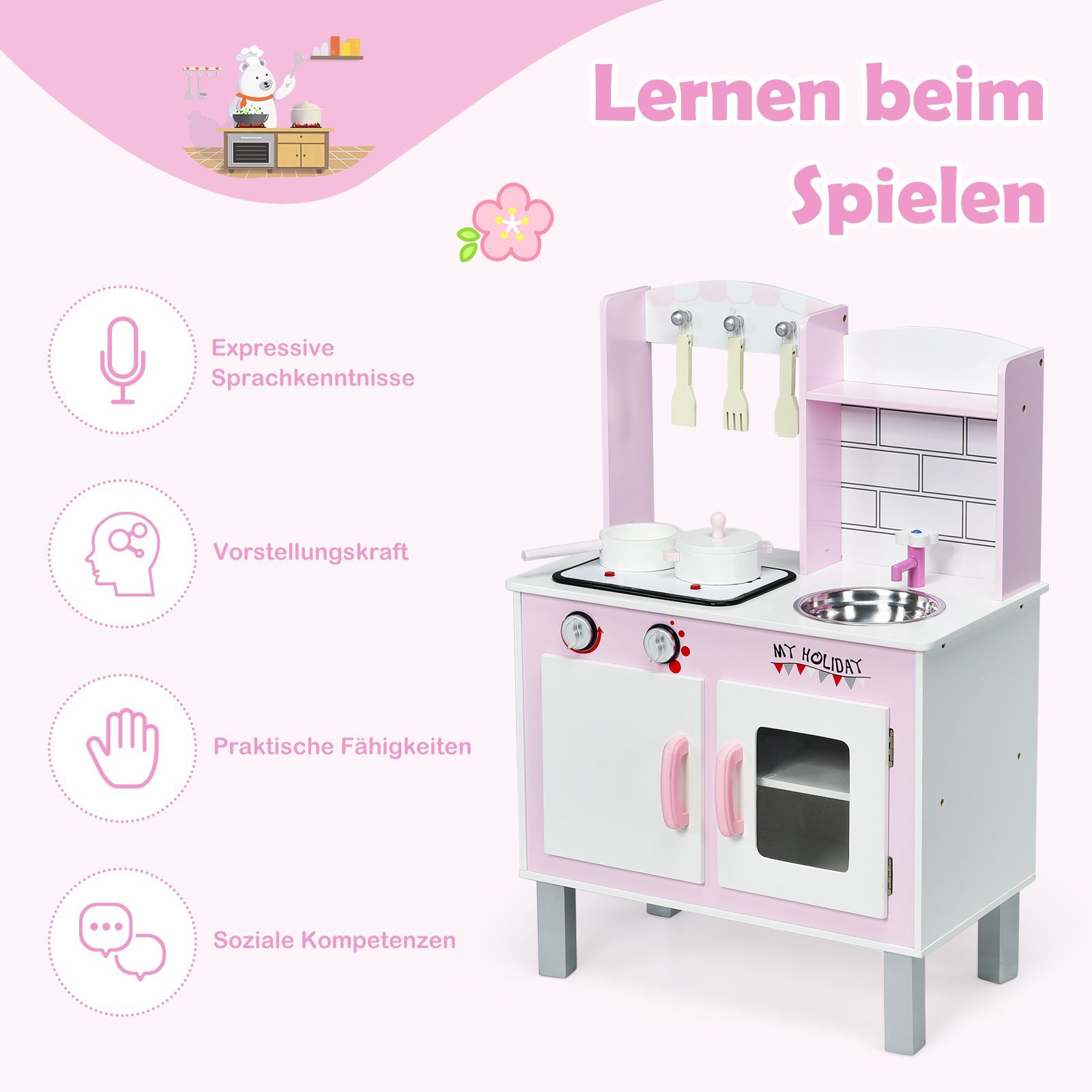 Dovanokite vaikams džiaugsmą ir skatinkite jų vaizduotę su šia žavinga medine virtuvėle! Sukurta atkartoti tikrus virtuvės elementus, ji leis mažiesiems pasijusti tikrais virėjais, tyrinėti maisto gaminimo pasaulį ir lavinti kūrybiškumą bei smulkiąją motoriką.