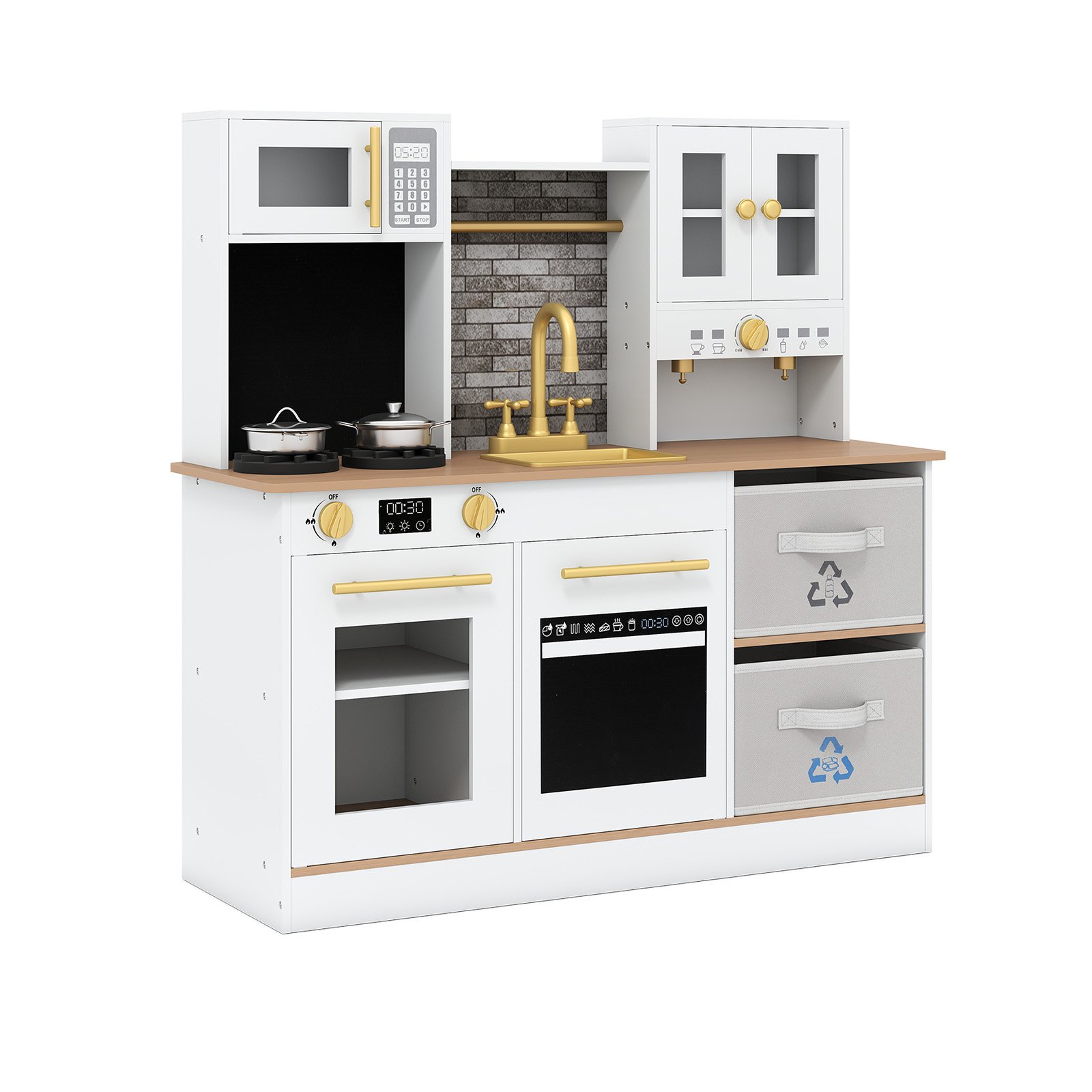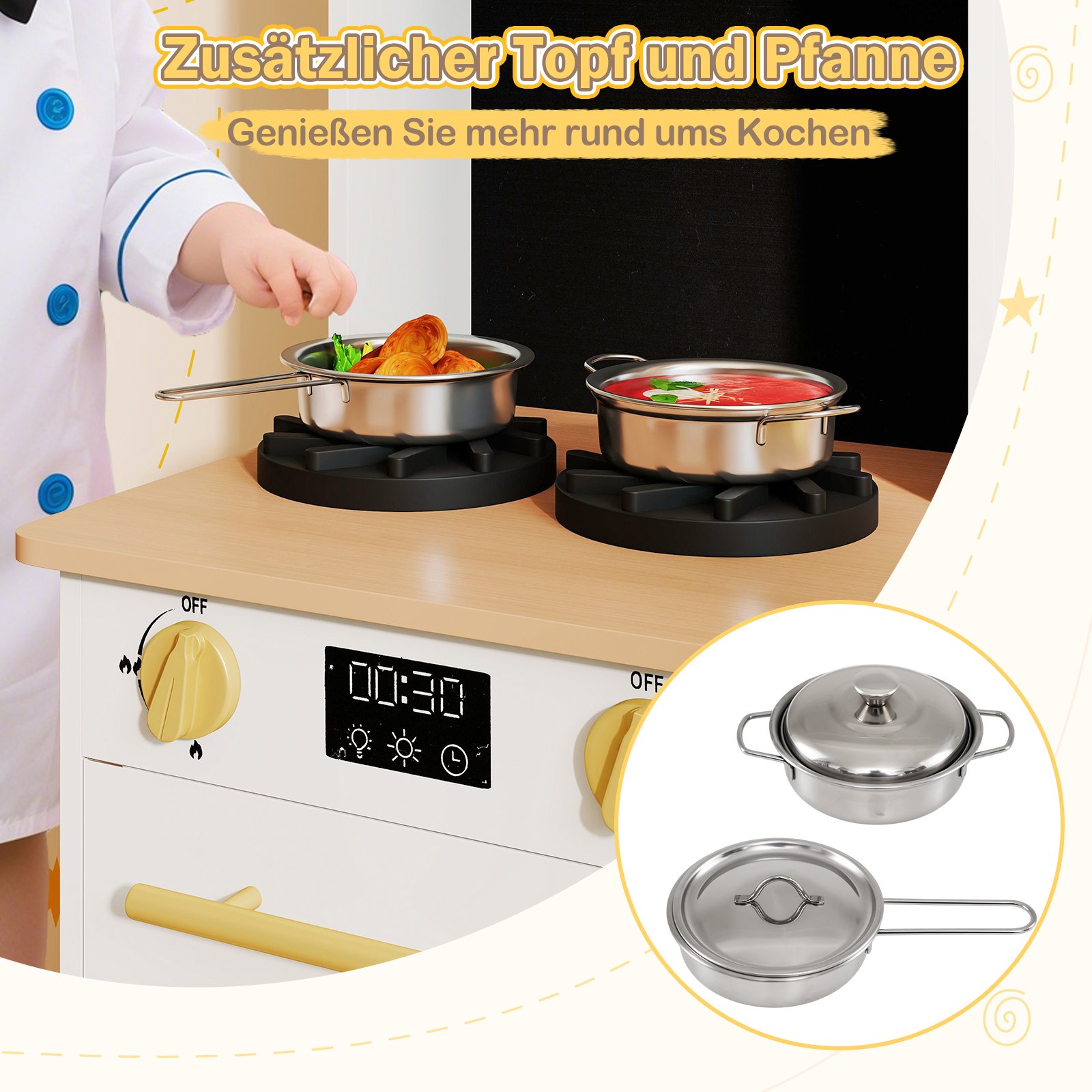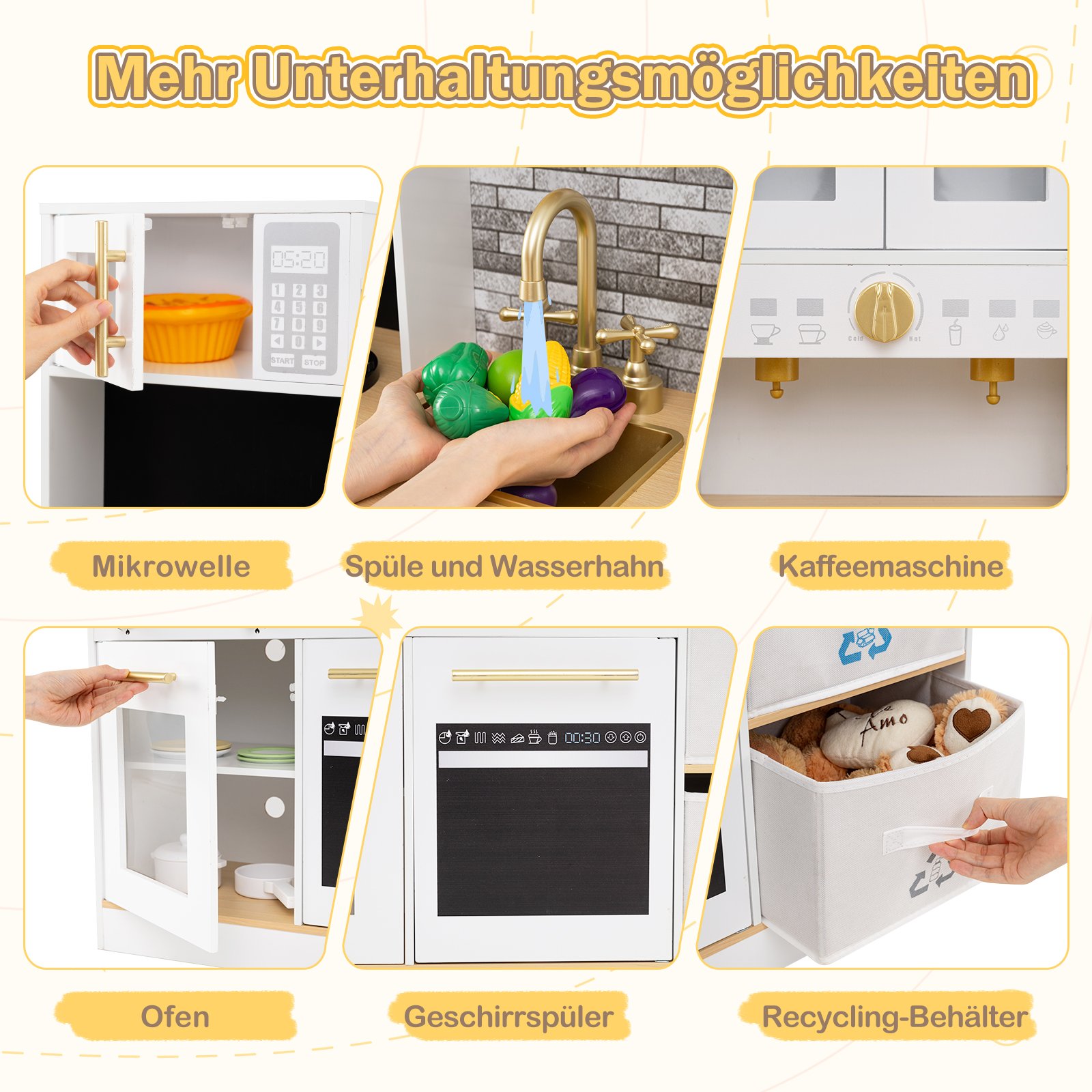 Įkvėpkite savo vaiko fantaziją su šia žavinga medine žaidimų virtuvėle, kuri atvers duris į begalę pramogų ir lavins kūrybiškumą. Su orkaite, mikrobangų krosnele, indaplove, kavos aparatu, kriaukle su čiaupu bei puodų ir keptuvių rinkiniu, ši virtuvėlė dovanos begalines valandas smagaus žaidimo. Realistiški garso ir šviesos efektai bei „spragtelintys“ mygtukai suteikia autentiškumo kiekvienam mažojo virėjo nuotykiui. Sukurta atsižvelgiant į saugumą ir ilgaamžiškumą, ši virtuvėlė įkvėps vaikus atrasti, kurti ir ugdytis tvarkingumo įgūdžius.