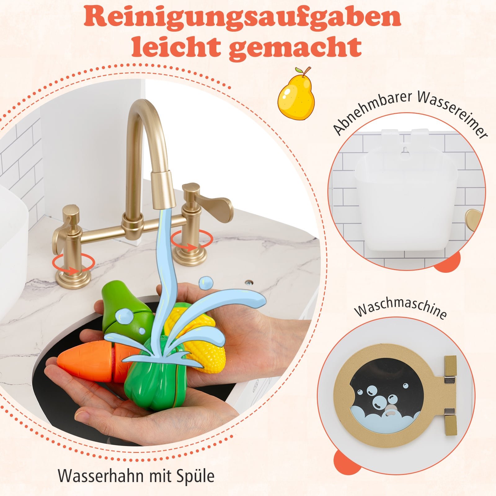 - Praktinės valymo funkcijos: Vandens čiaupas su kriaukle, išimamu vandens kibirėliu ir skalbimo mašina leidžia vaikams mėgdžioti kasdienes užduotis ir ugdyti atsakomybę.