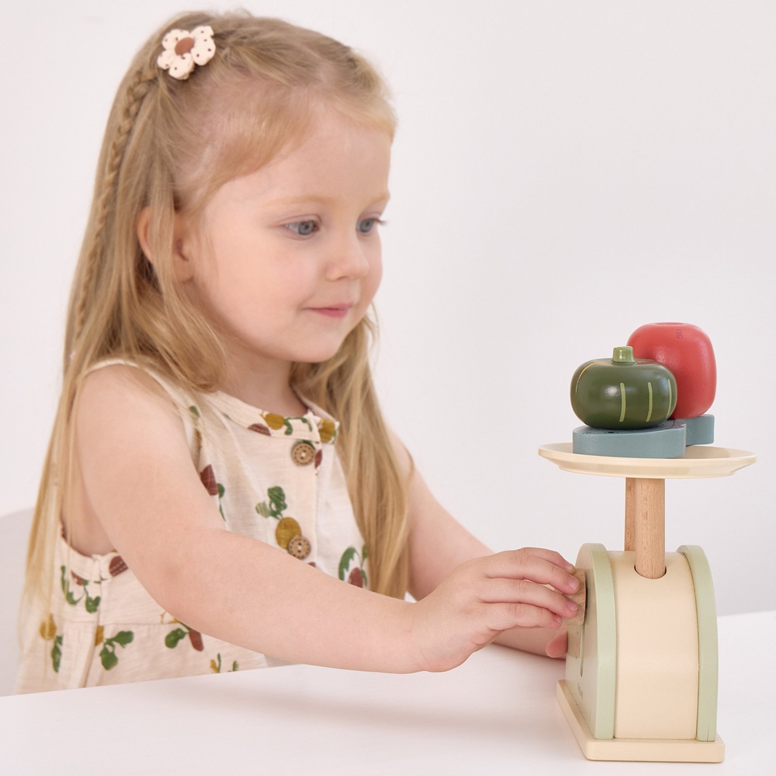Šios medinės svarstyklės yra edukacinis žaislas, padedantis mažiesiems susipažinti su svorio ir skaičiavimo sąvokomis. Dėl judančios svirties vaikas gali stebėti, kaip nustatoma įvairių daiktų pusiausvyra, taip ugdydamas pagrindinių fizikos principų supratimą. Šios medinės svarstyklės tinka žaidimams parduotuvėje ar virtuvėje, sujungia mokymąsi su pramoga ir užtikrina valandų valandas edukacinių užsiėmimų. Rinkinyje nėra vaisių.